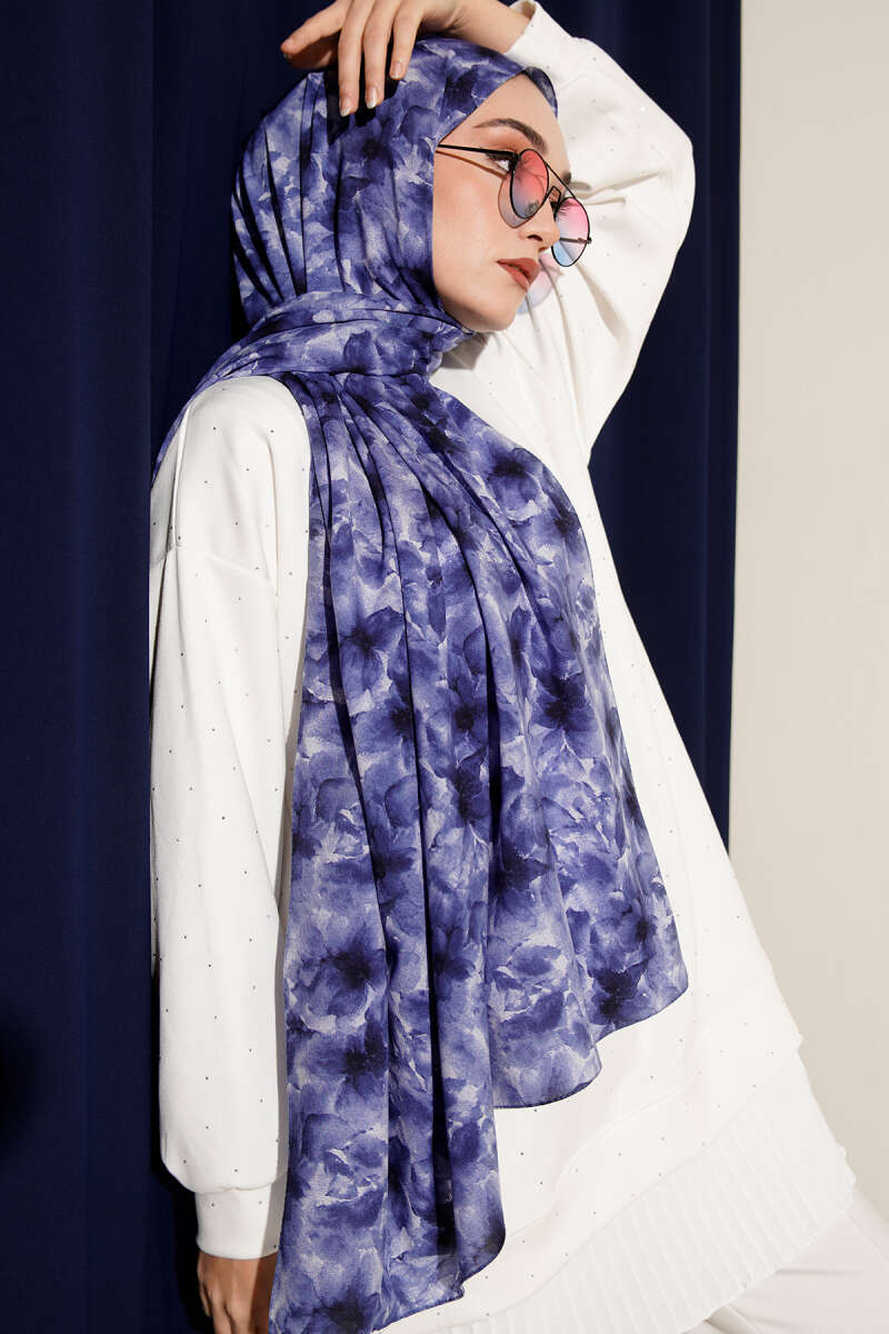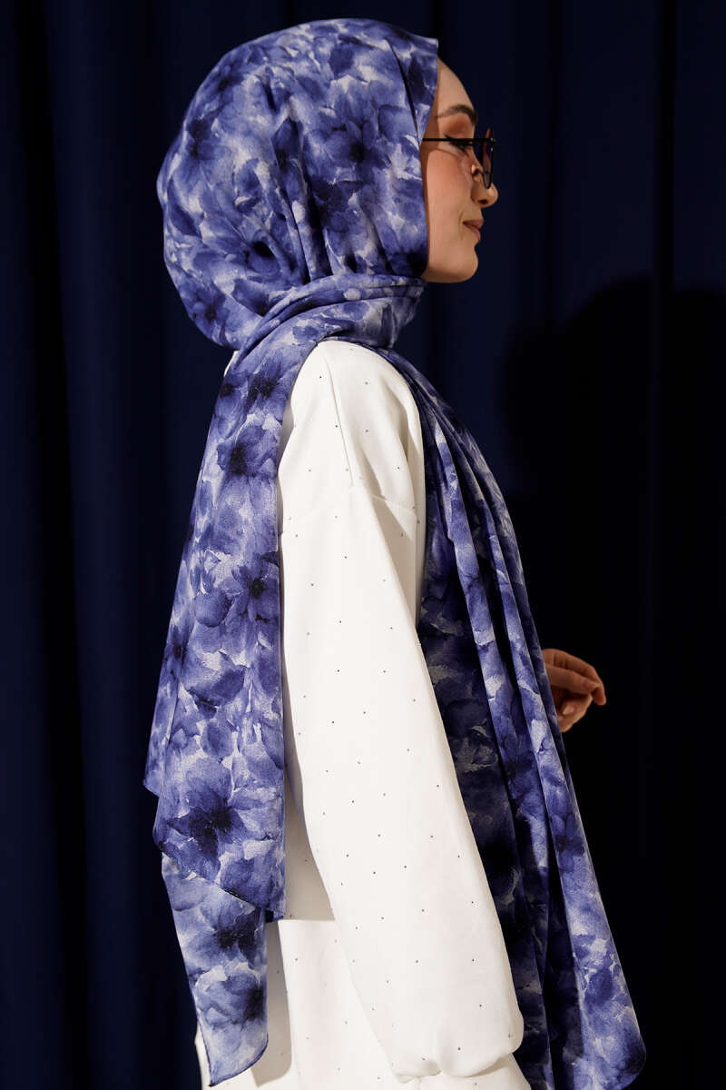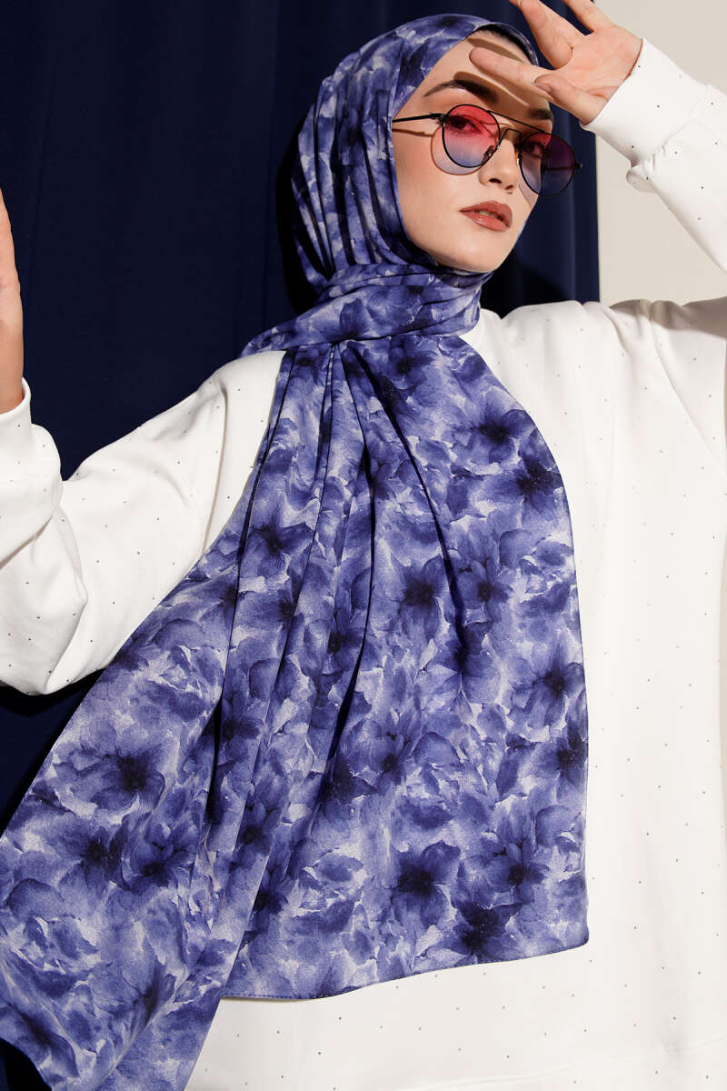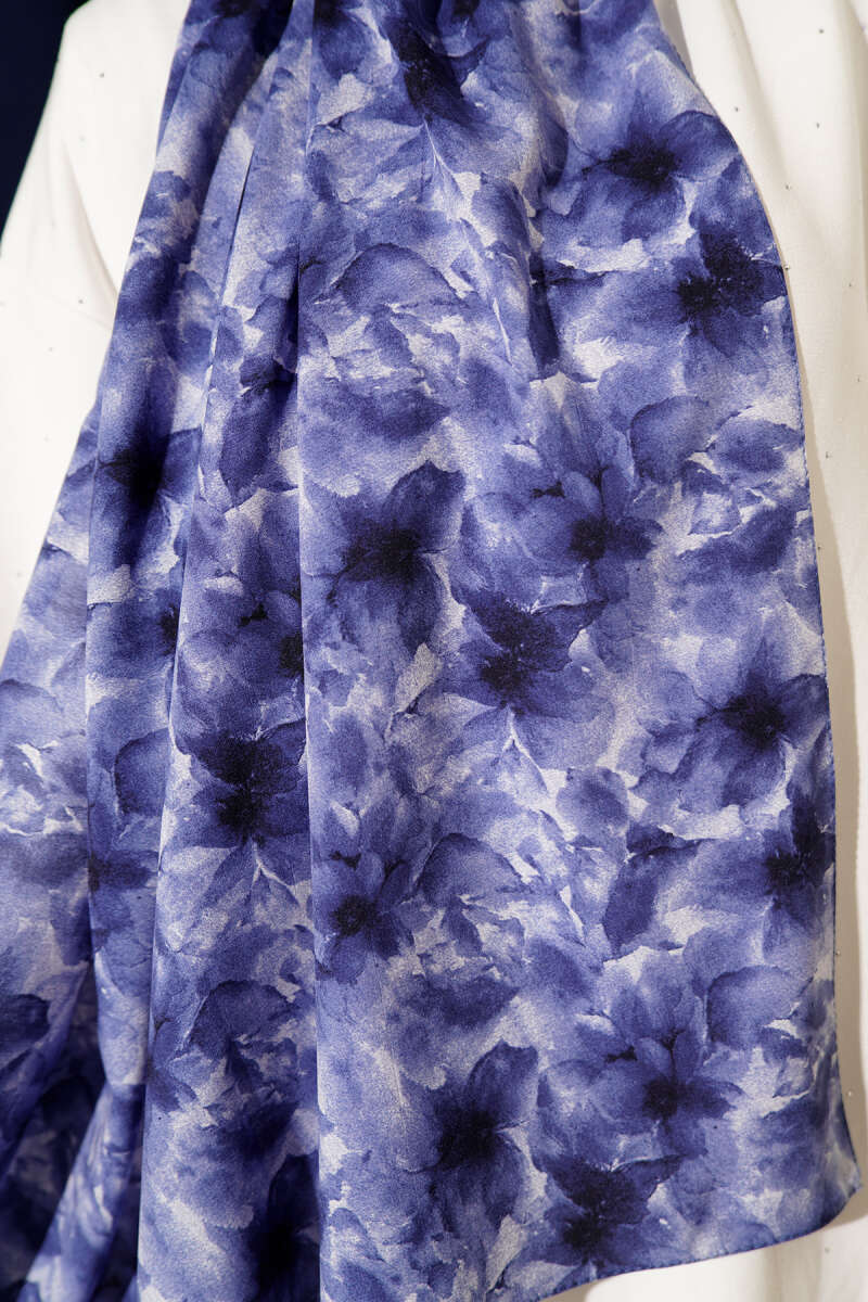 Çiçek Desenli Rami Şal Lacivert