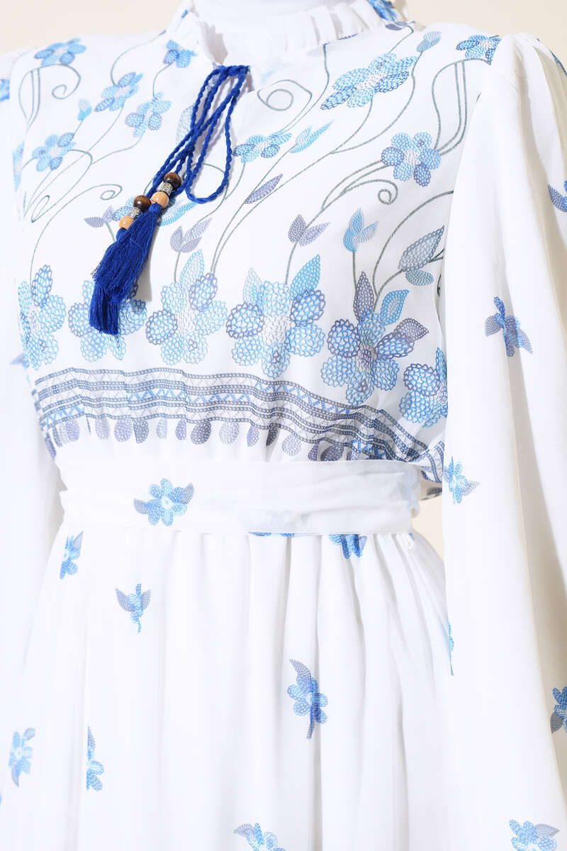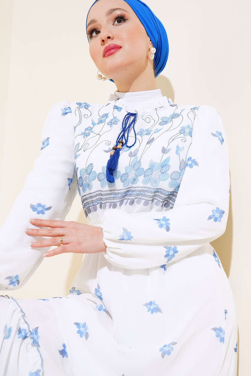 Çiçek Desenli Şifon Elbise Mavi
