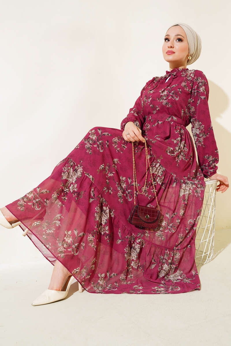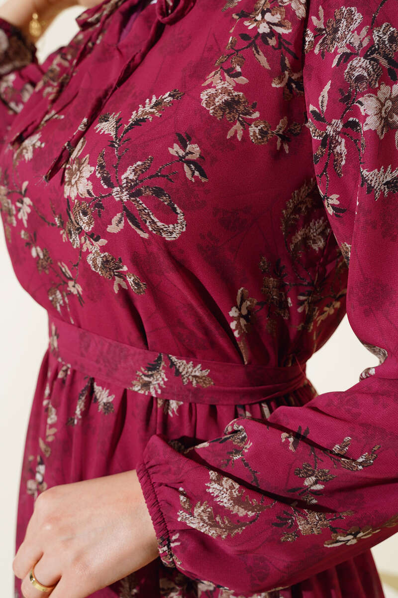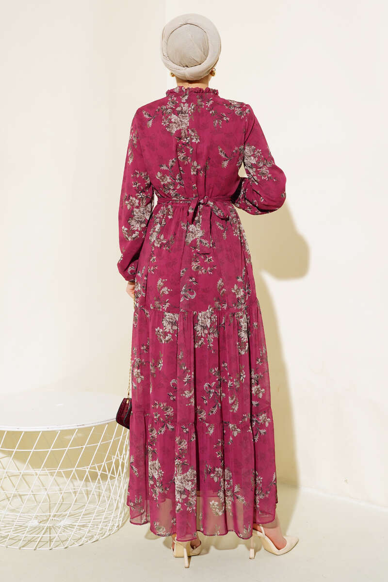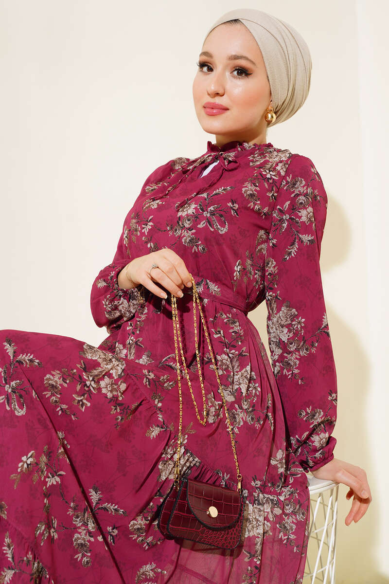 Çiçek Desenli Şifon Kat Elbise Bordo