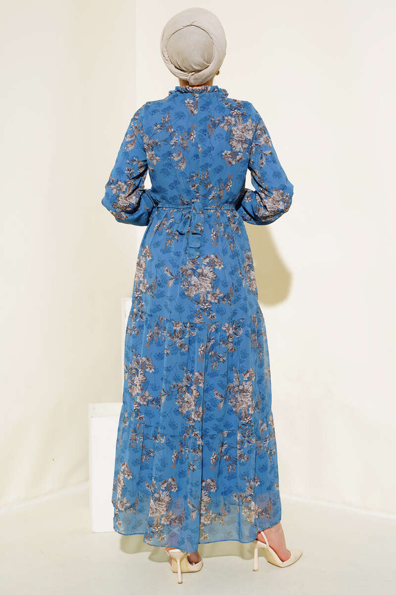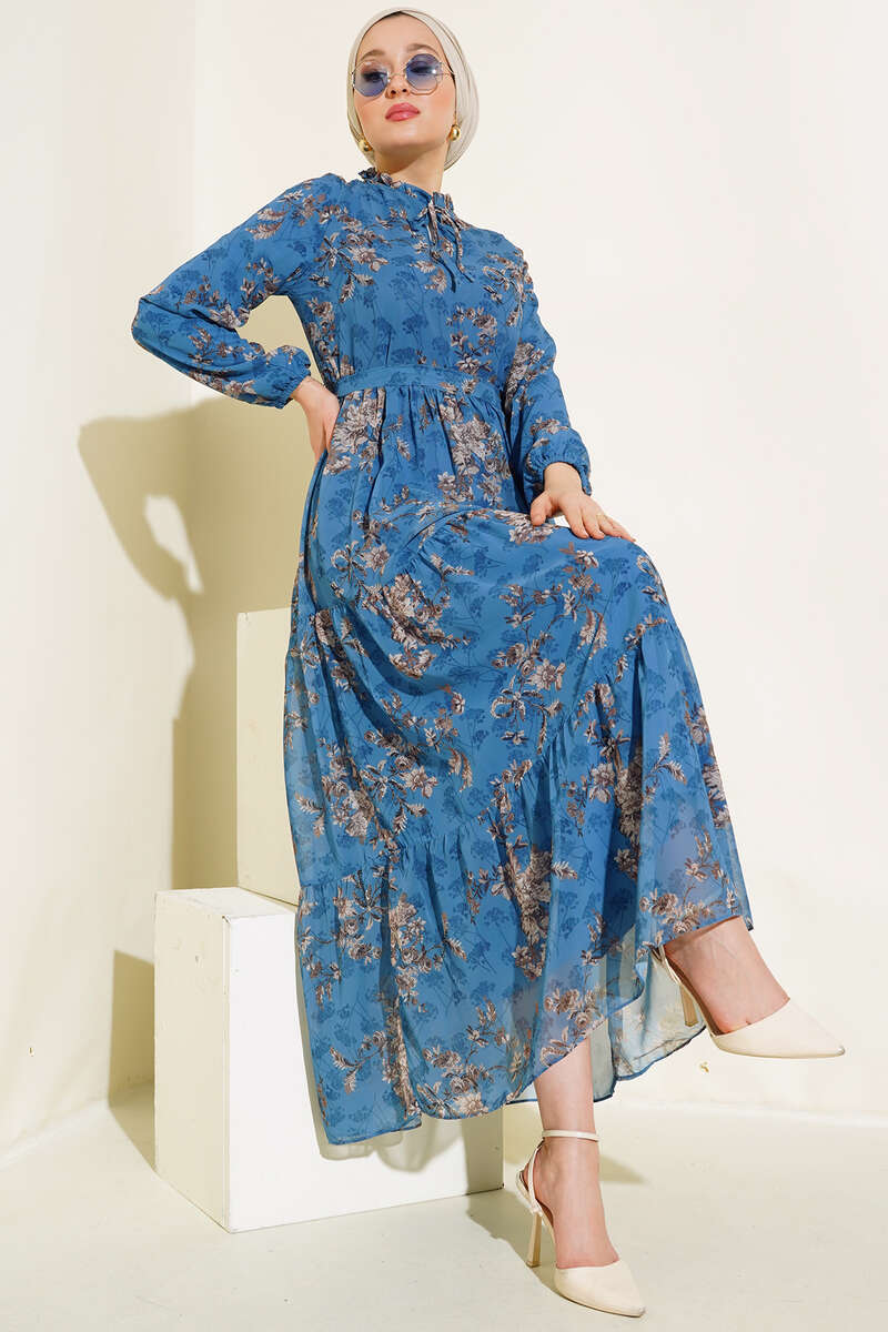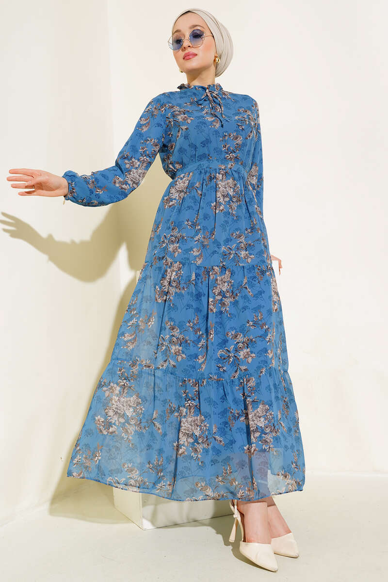 Çiçek Desenli Şifon Kat Elbise İndigo