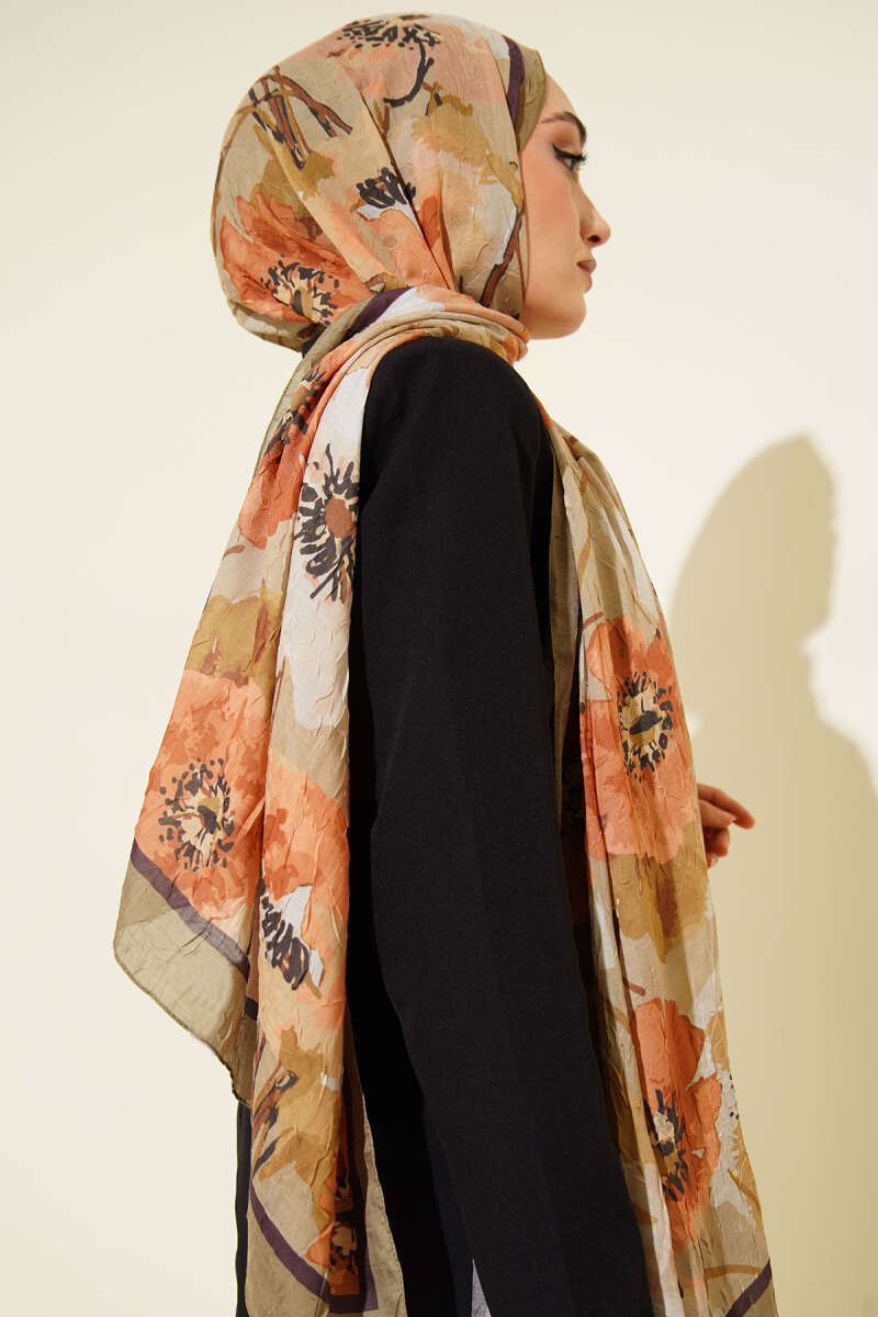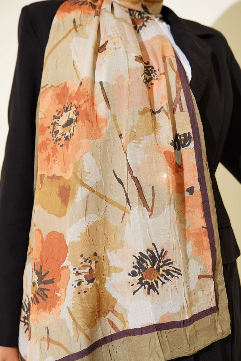 Çiçek Desenli Soft Bambu Kraş Şal Vizon