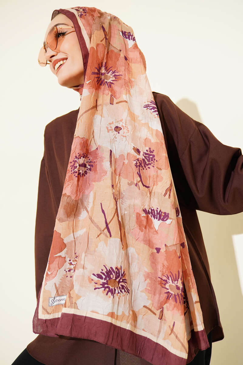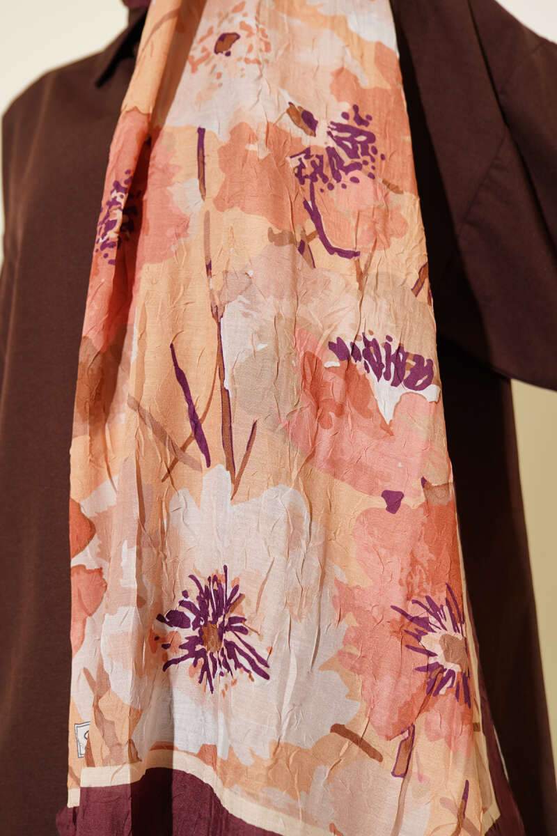 Çiçek Desenli Soft Bambu Kraş Şal Kahve