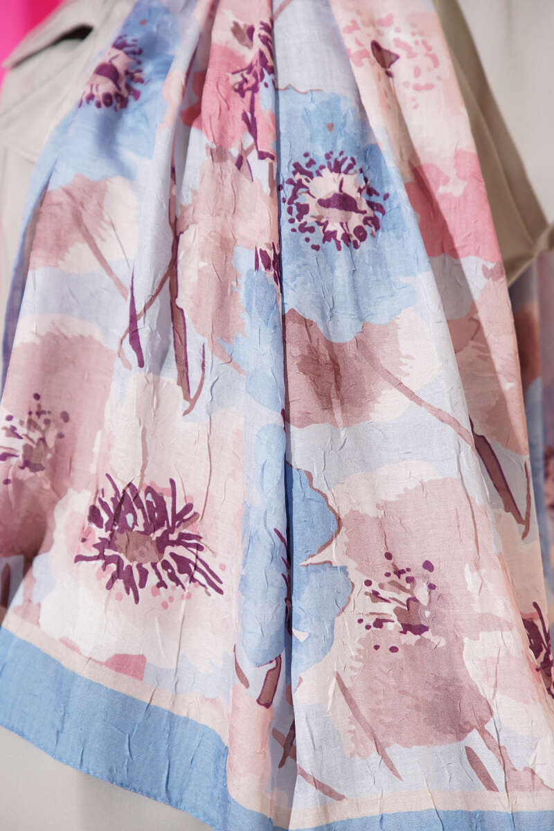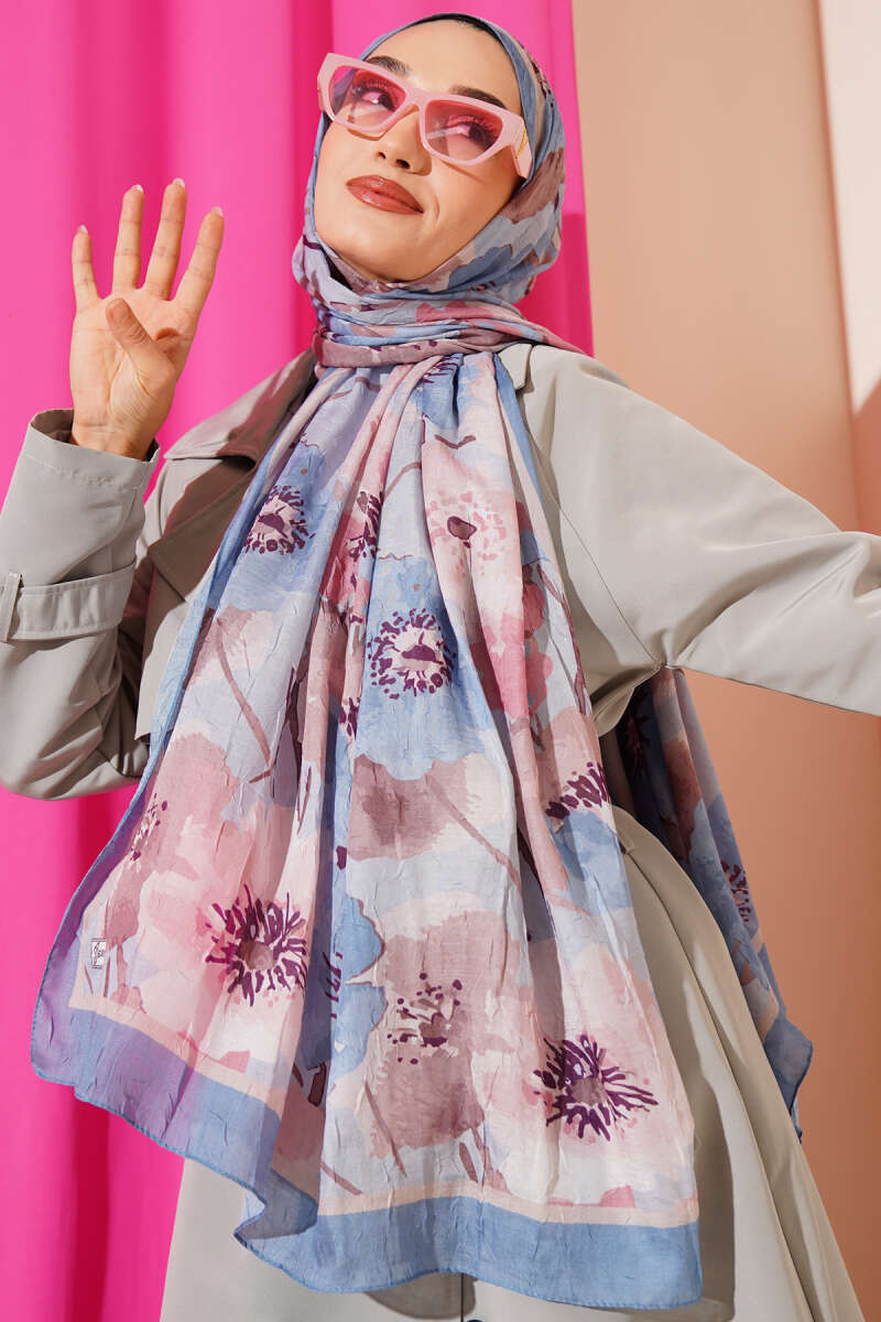 Çiçek Desenli Soft Bambu Kraş Şal Soft Mavi