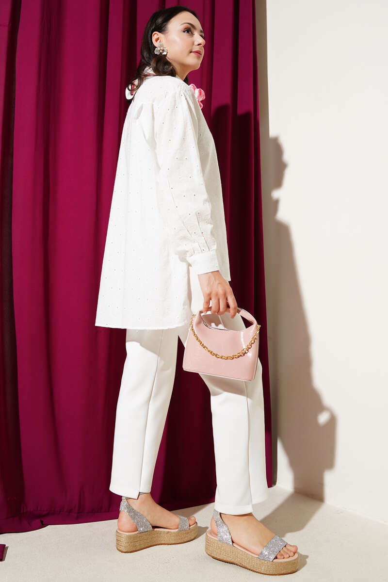 Çiçek Detaylı Brodeli Gömlek Ekru