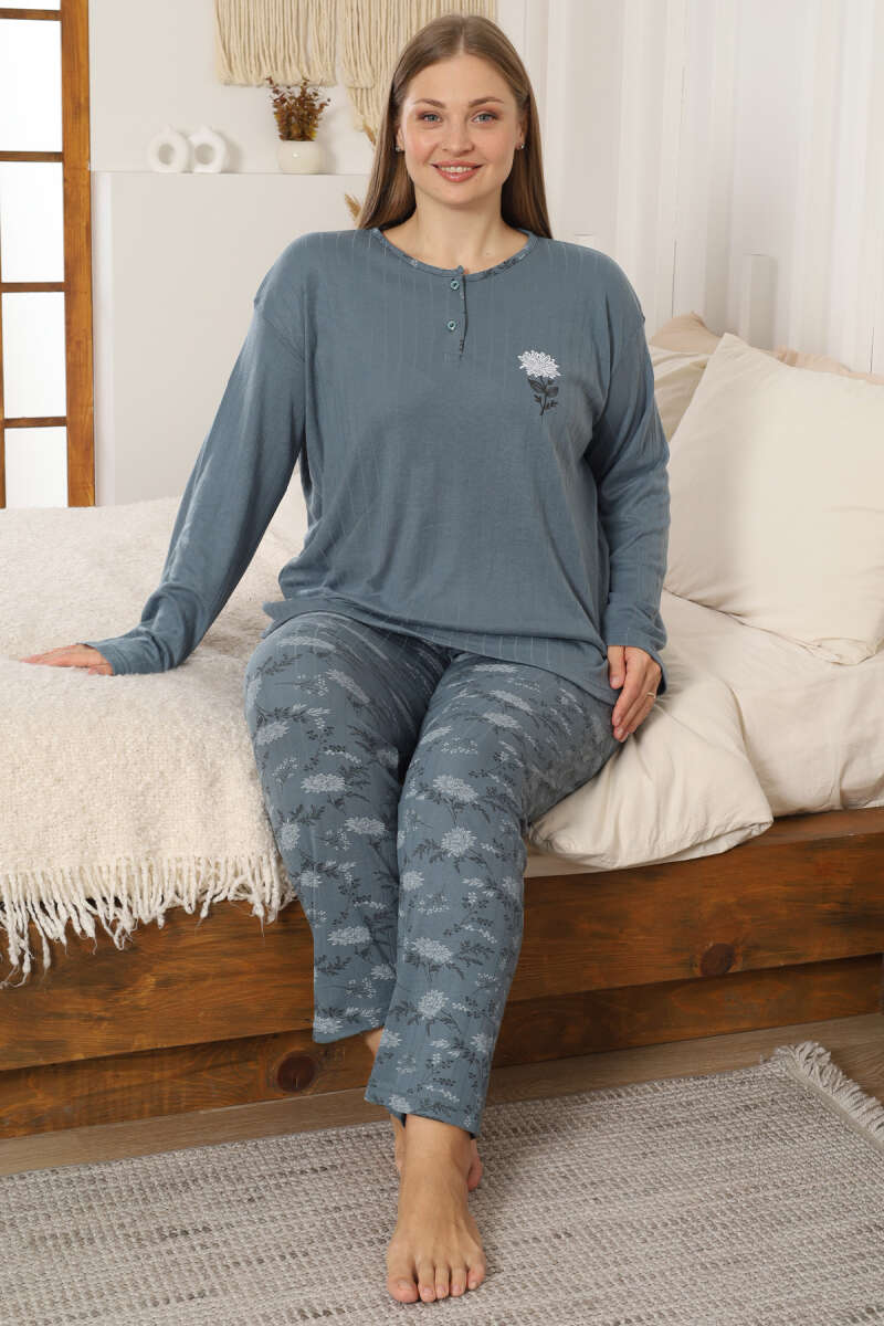 Çiçek Detaylı Büyük Beden Kadın Pijama Takımı Petrol