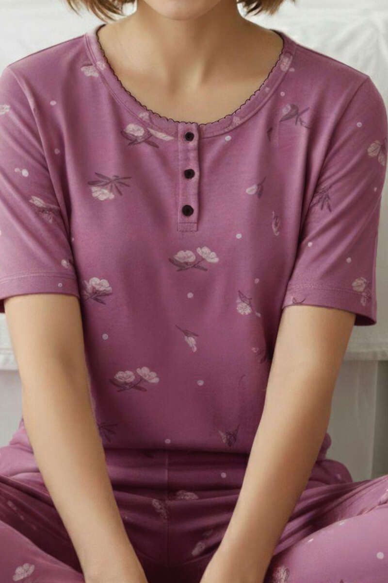 Çiçek Detaylı Düğmeli Kısa Kol Pijama Takımı Gül Kurusu