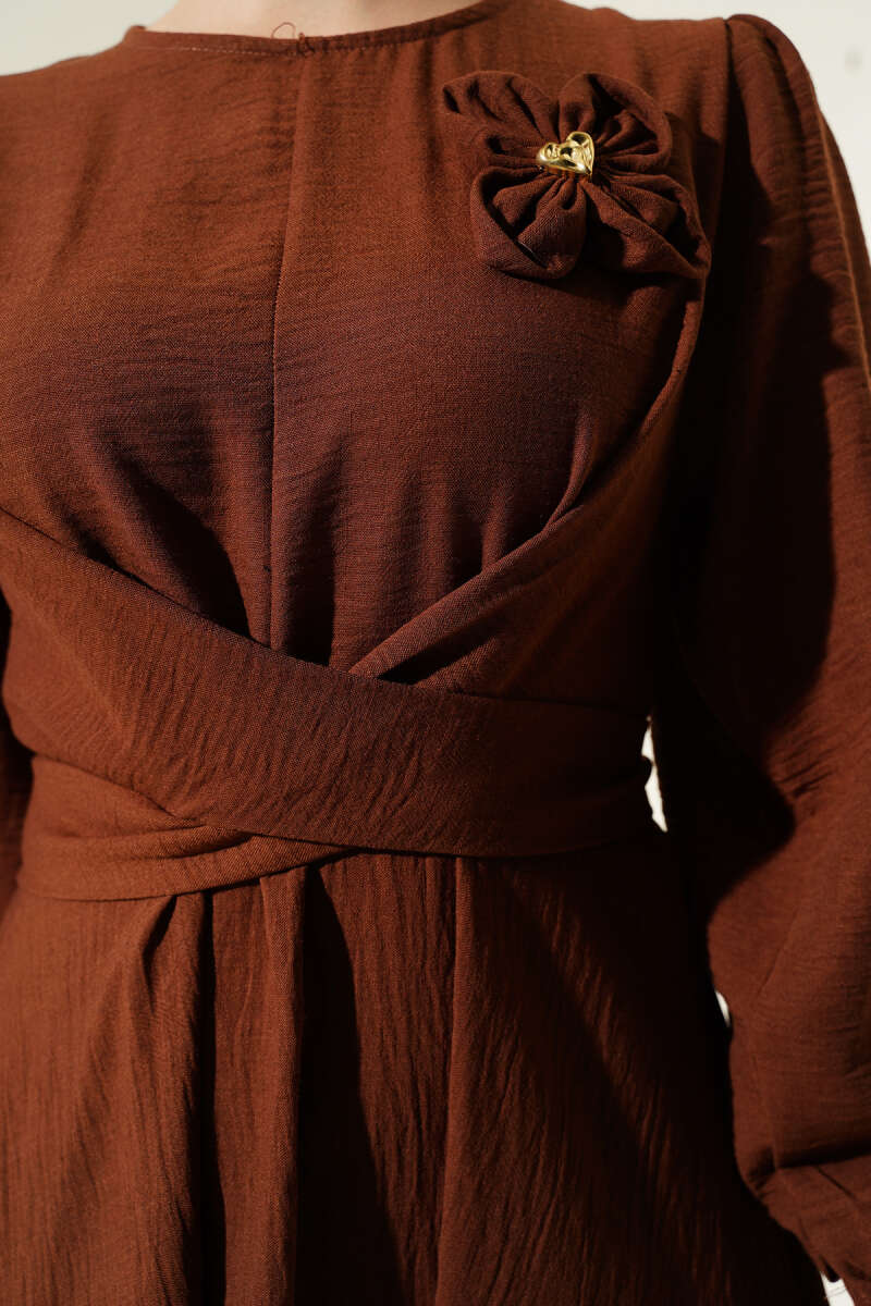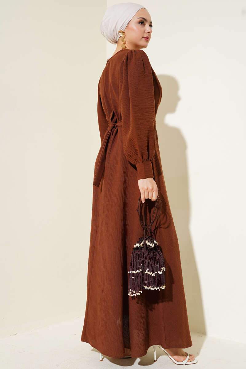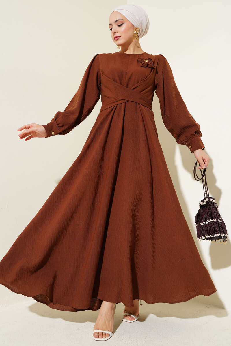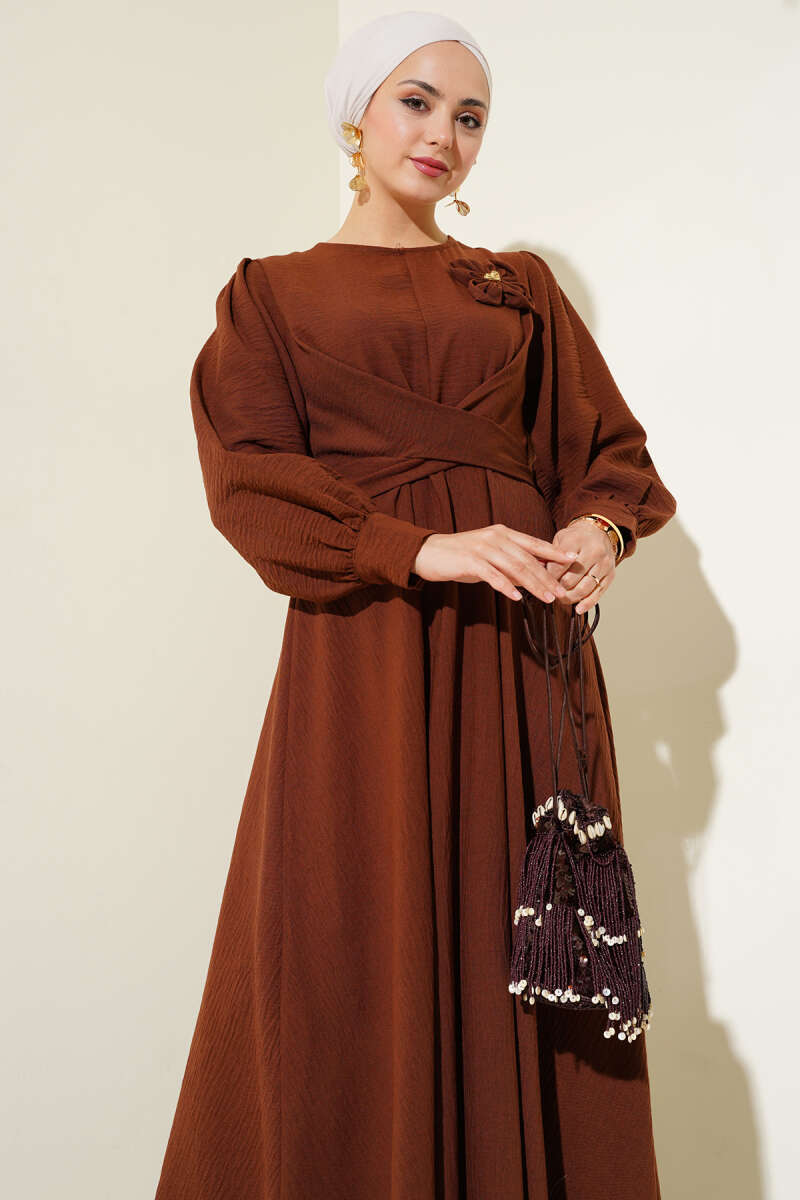 Omuz Pelerin Detaylı Abiye Elbise Kahve