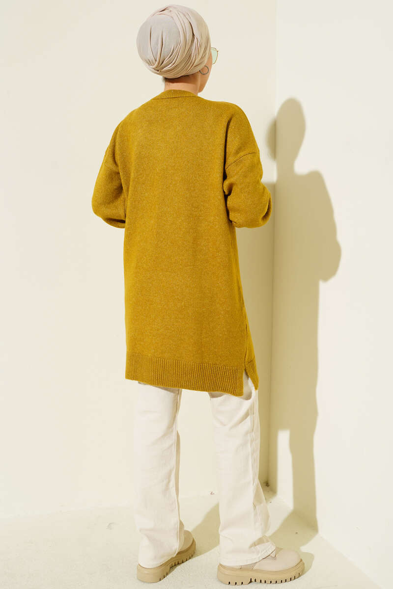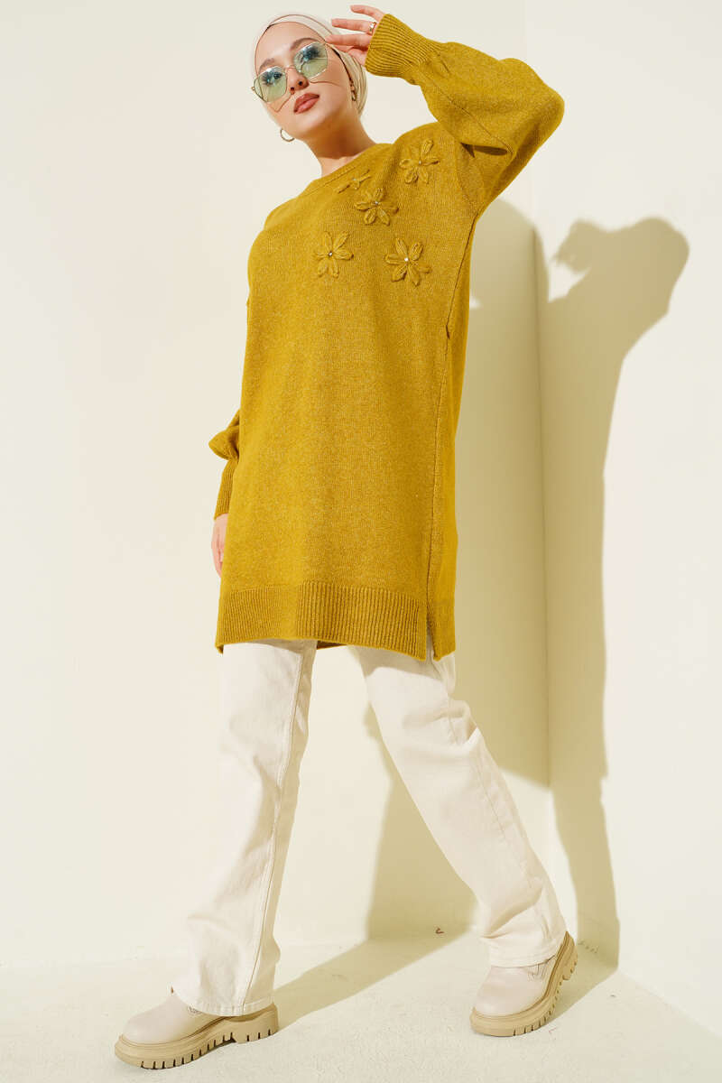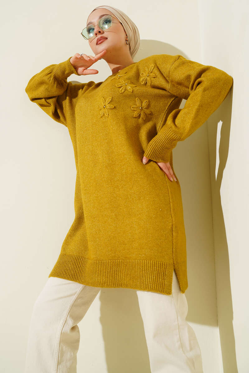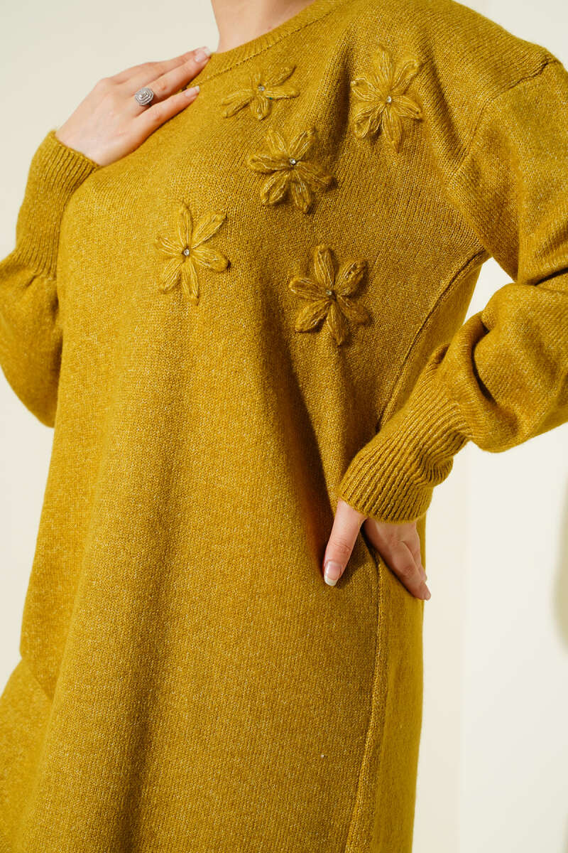 Çiçek Detaylı Yumoş Triko Tunik Yağ Yeşili