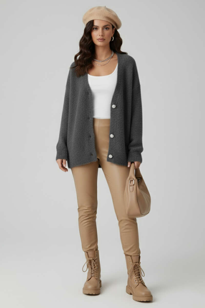 Çiçek Düğme Detaylı Triko Hırka Füme