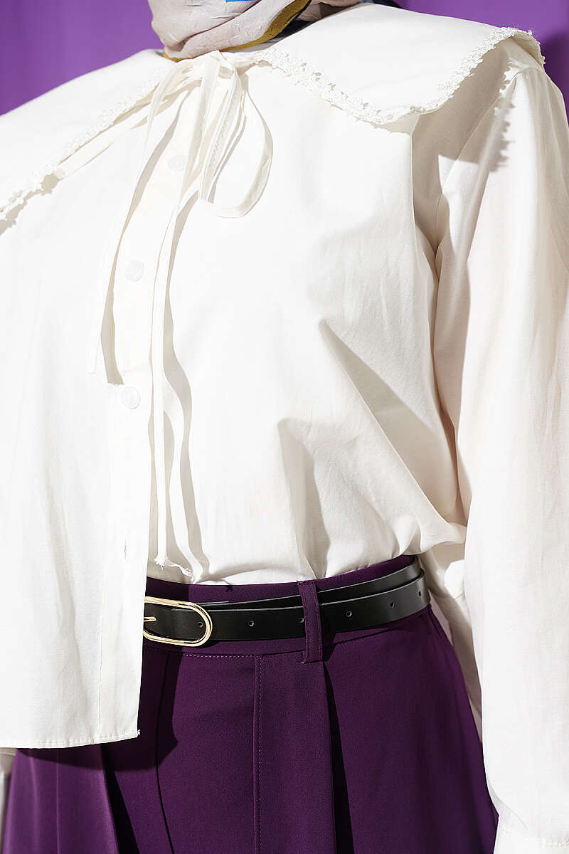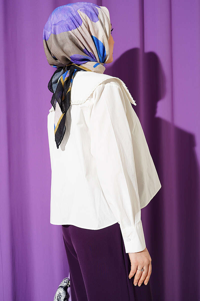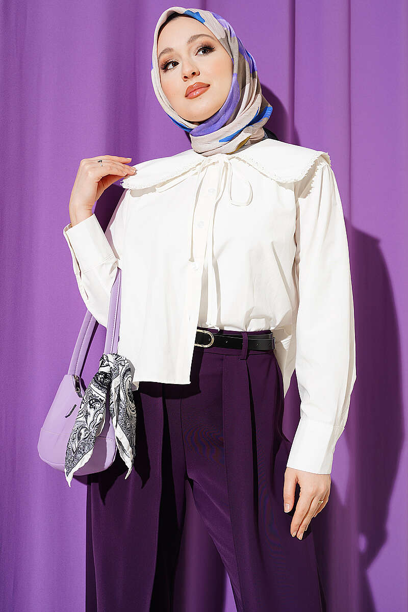 Çiçek Güpürlü Önlük Yaka Kısa Gömlek Ekru