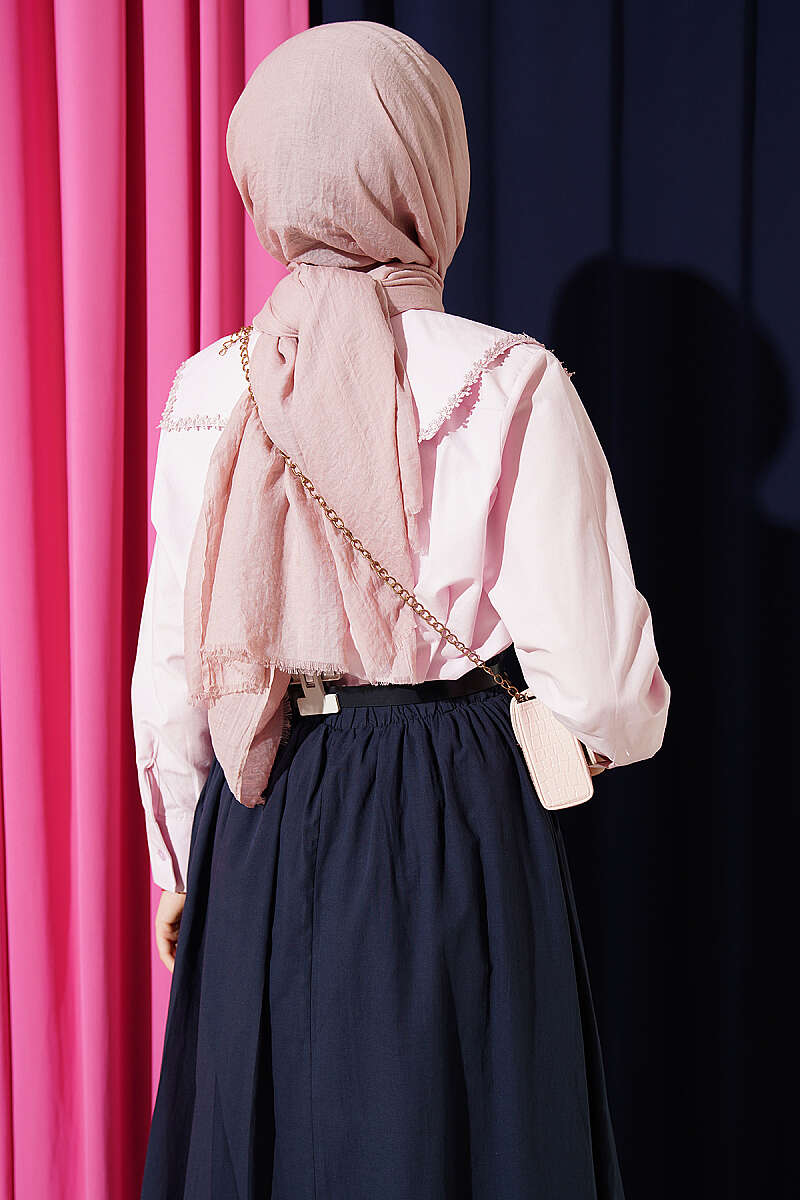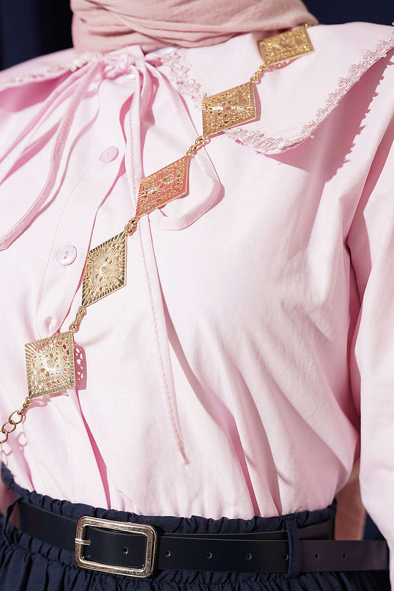 Çiçek Güpürlü Önlük Yaka Kısa Gömlek Pembe