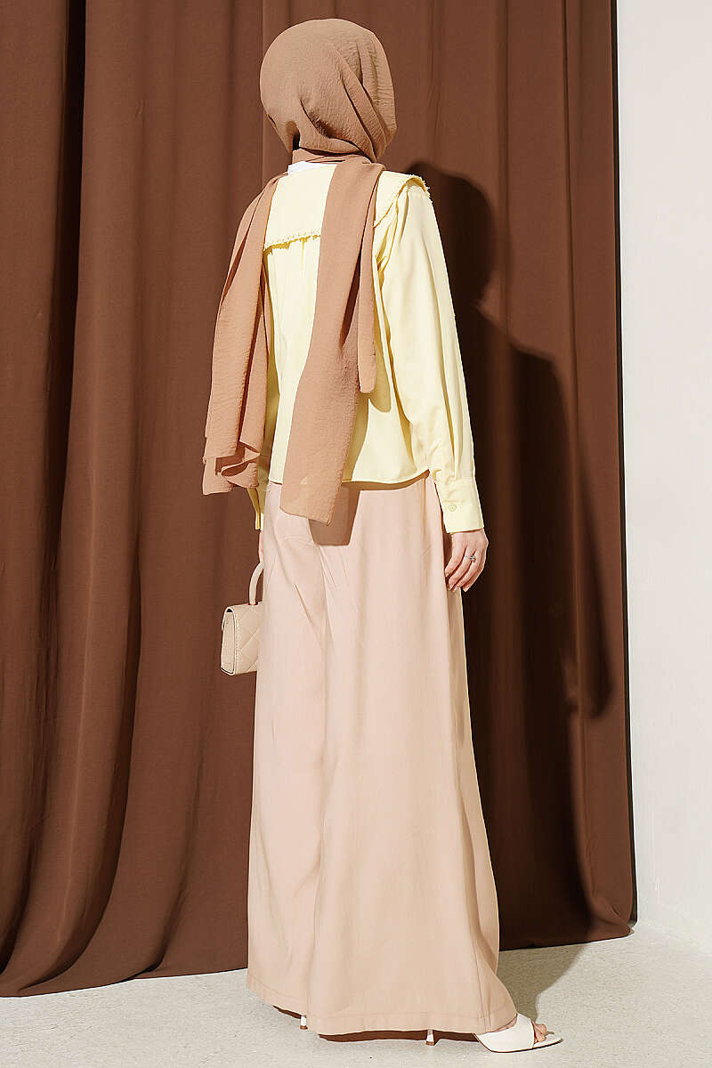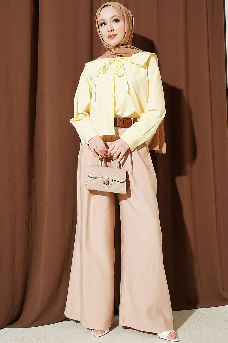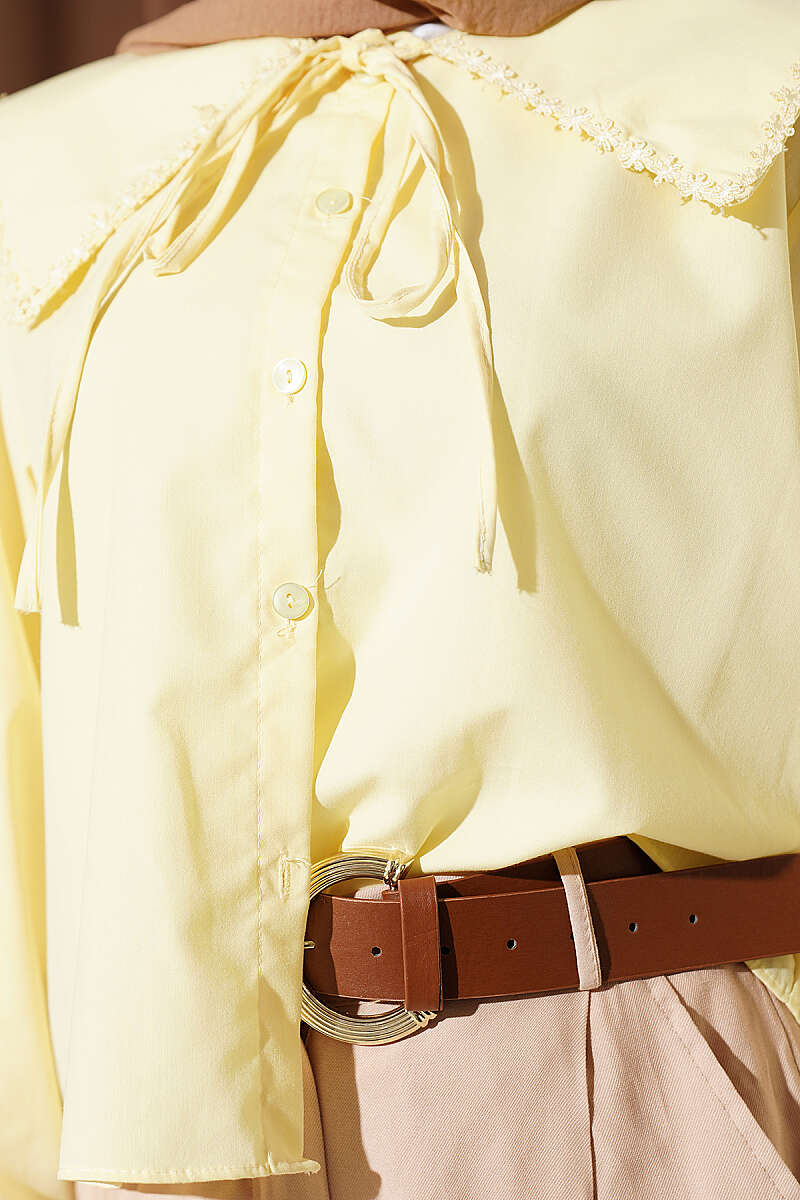 Geniş önlük yaka tasarımı ve yakasındaki zarif çiçek güpür detaylarıyla romantik bir stil sunan bu gömlek, klasik kesime modern bir yorum getiriyor. Yakada yer alan ince bağlama detayı ve manşetli kolları, tasarıma feminen ve sofistike bir hava katıyor. Kısa ve formlu kesimi sayesinde yüksek bel pantolon veya eteklerle mükemmel bir uyum yakalayarak çabasız bir şıklık oluşturuyor. Hem günlük kombinlerde hem de daha özel buluşmalarda tarzınızı ön plana çıkaracak, detaylarıyla fark yaratan bir parçadır.