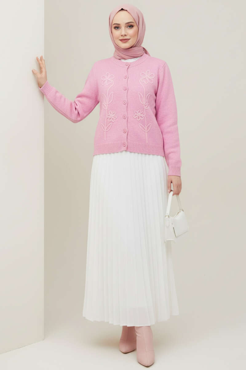 Cepli Örgü Desenli Uzun Hırka Ekru