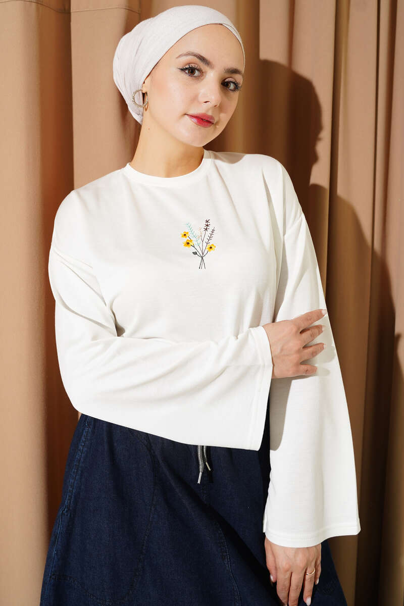 Çiçek İşlemeli Loyşa Bluz Ekru