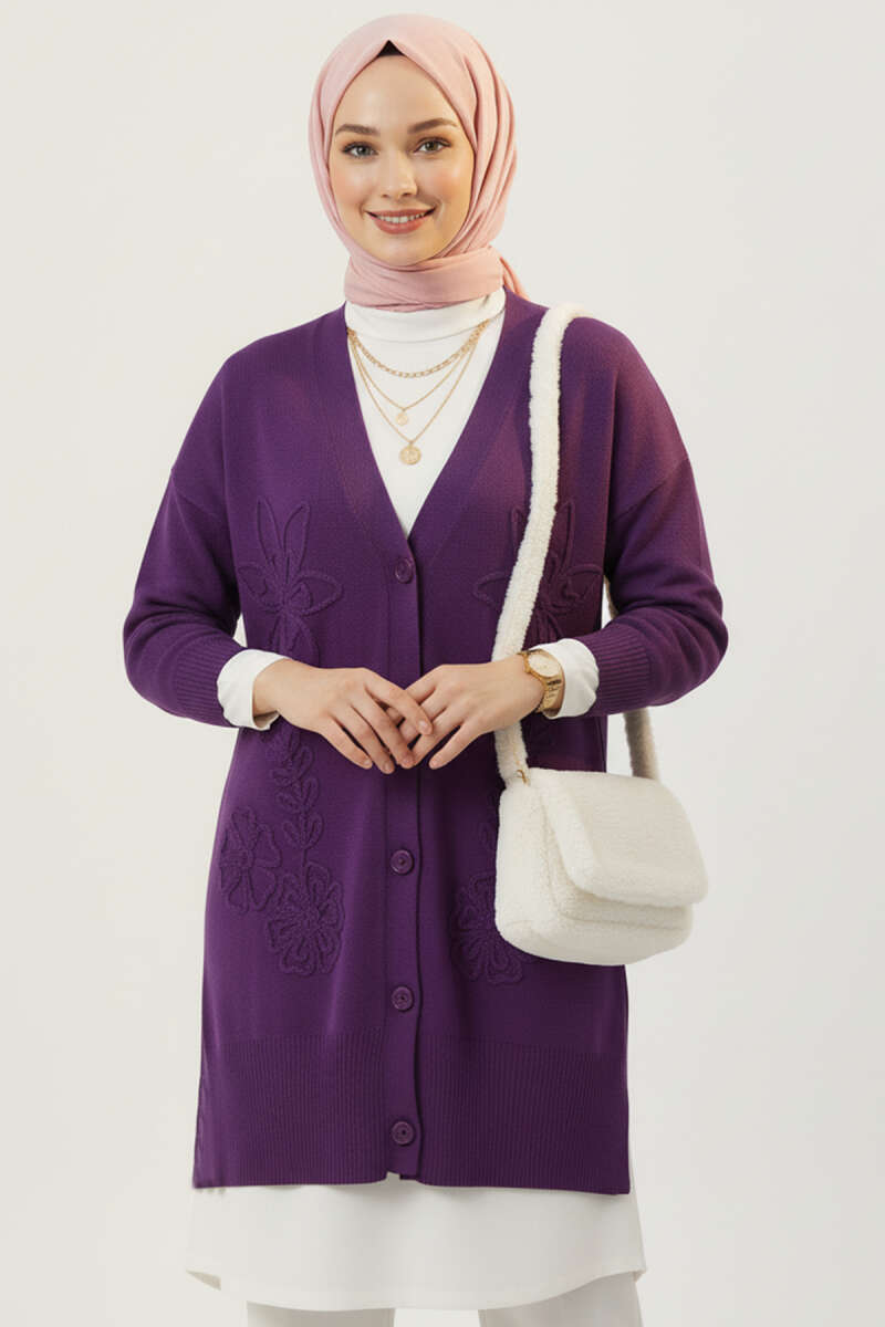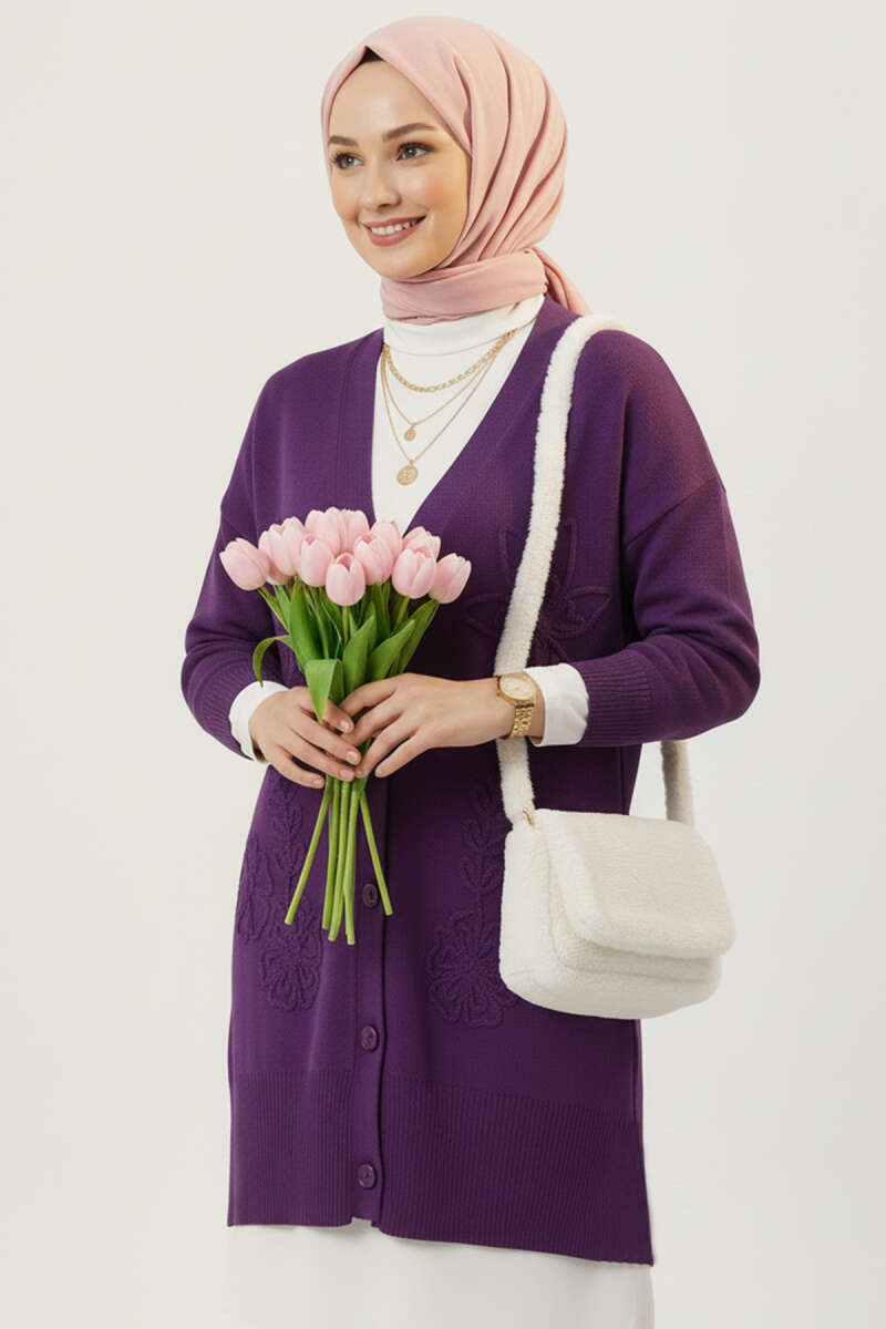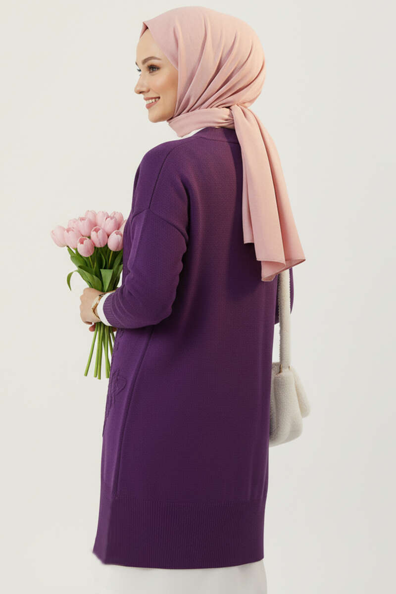 Zigzag Desenli Düğmeli Merserize Hırka Lila