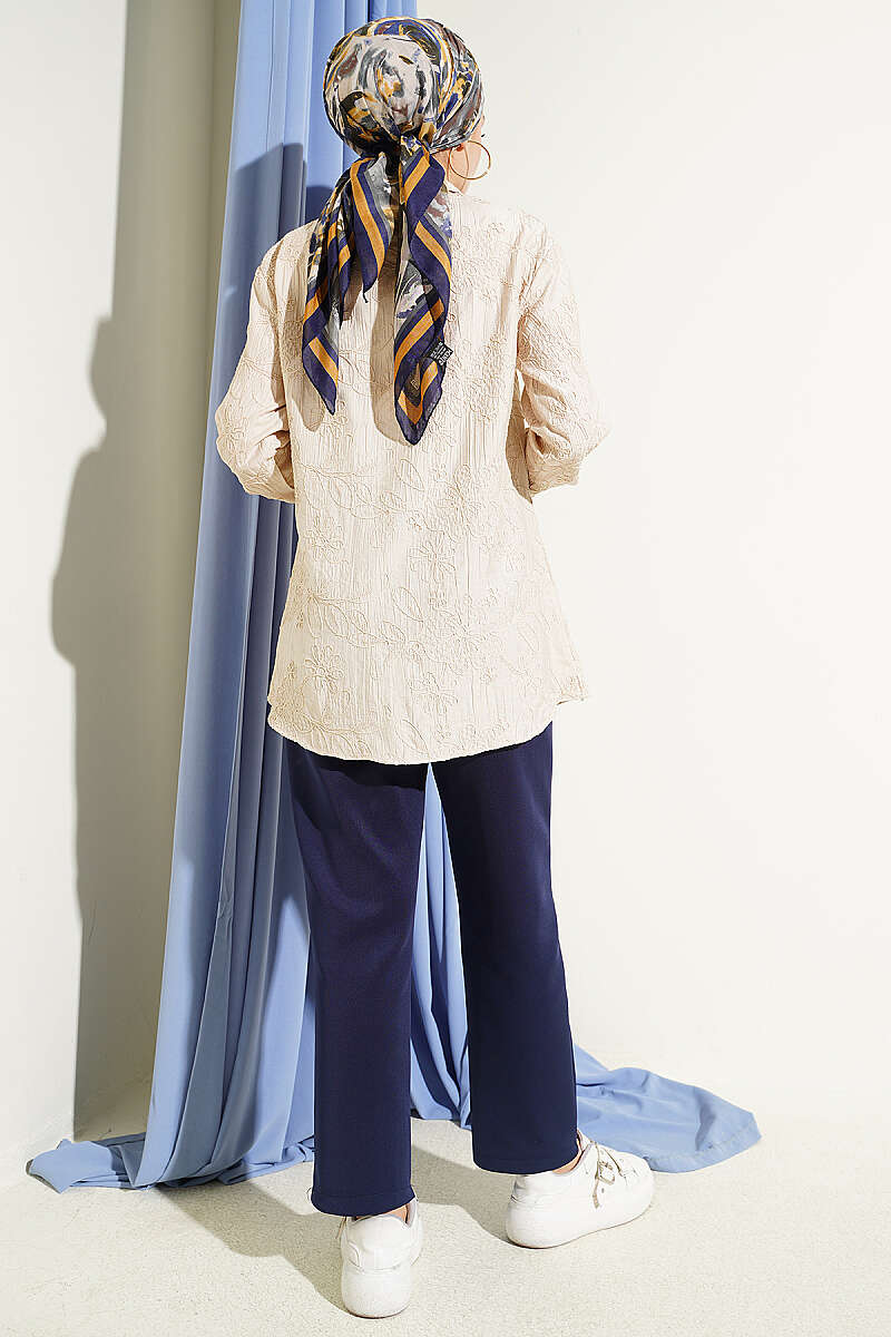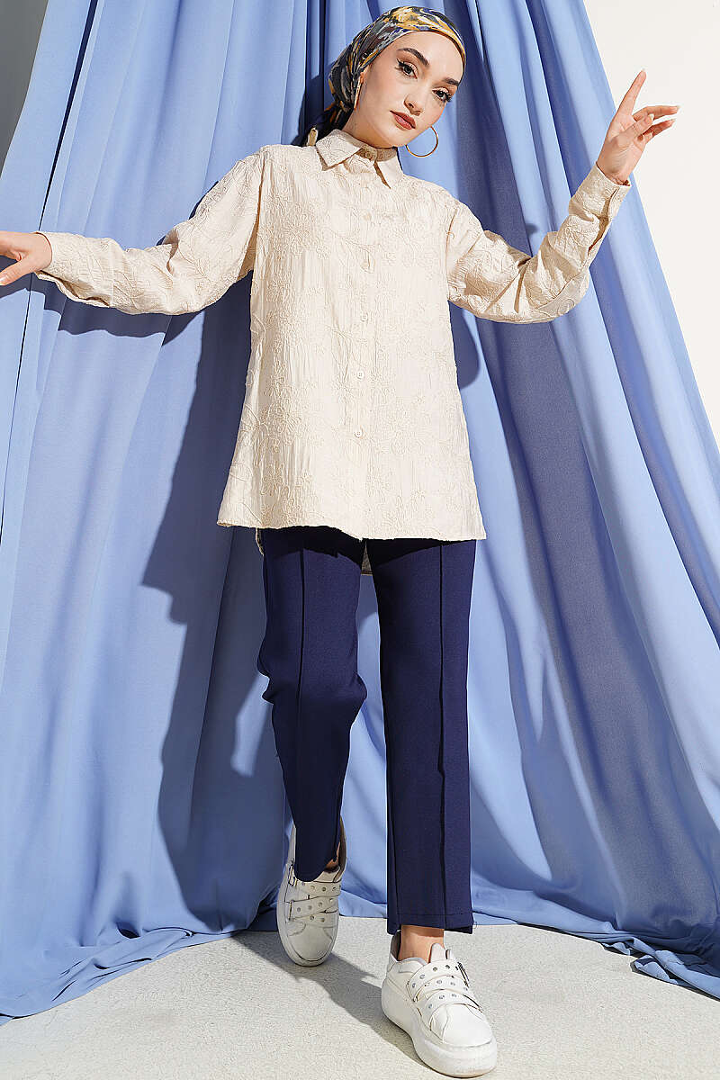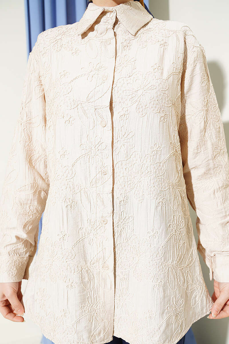 Çiçek Kabartmalı Basic Gömlek Ekru