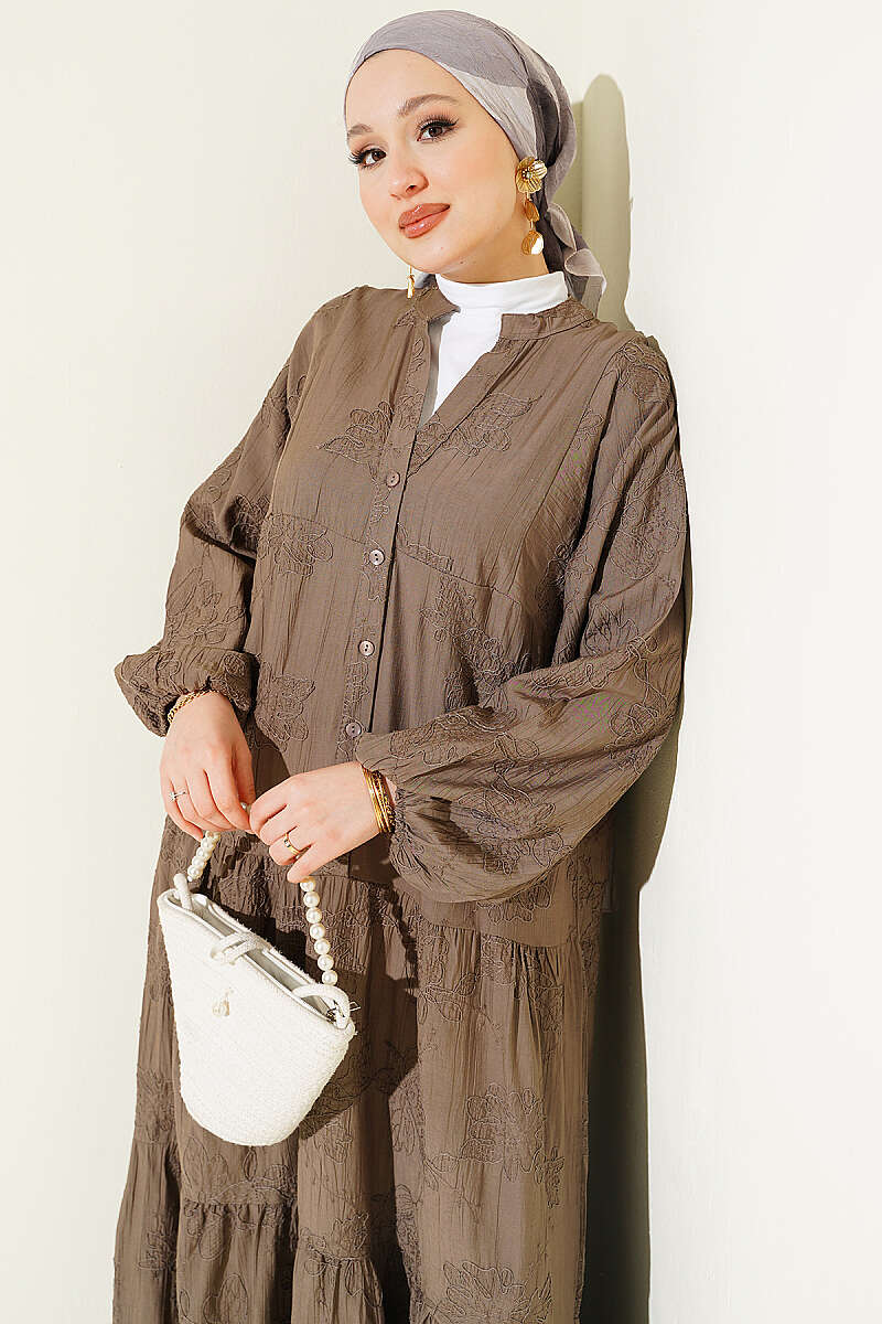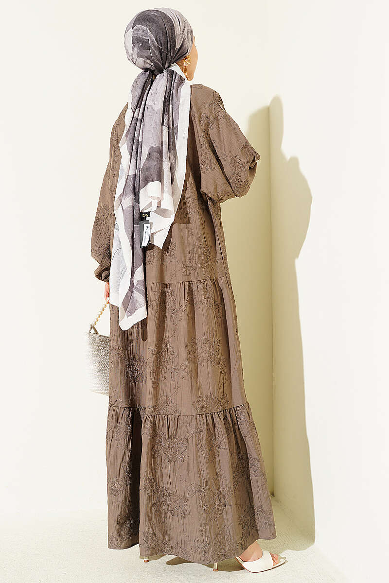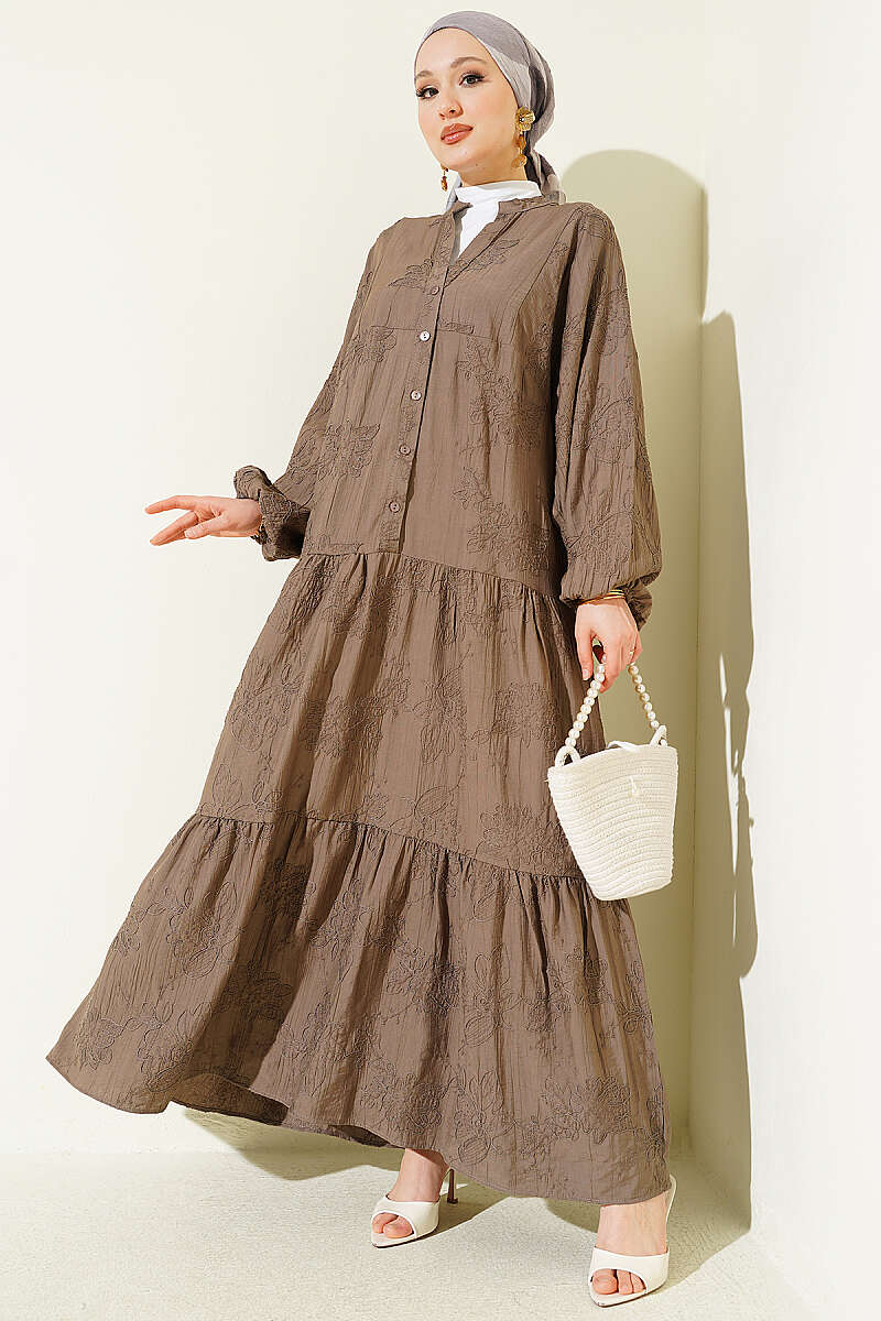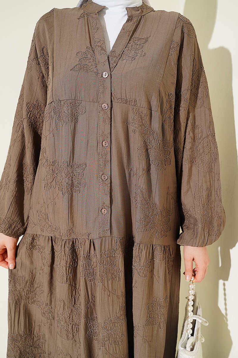 Çiçek Kabartmalı Hakim Yaka Katlı Elbise Vizon