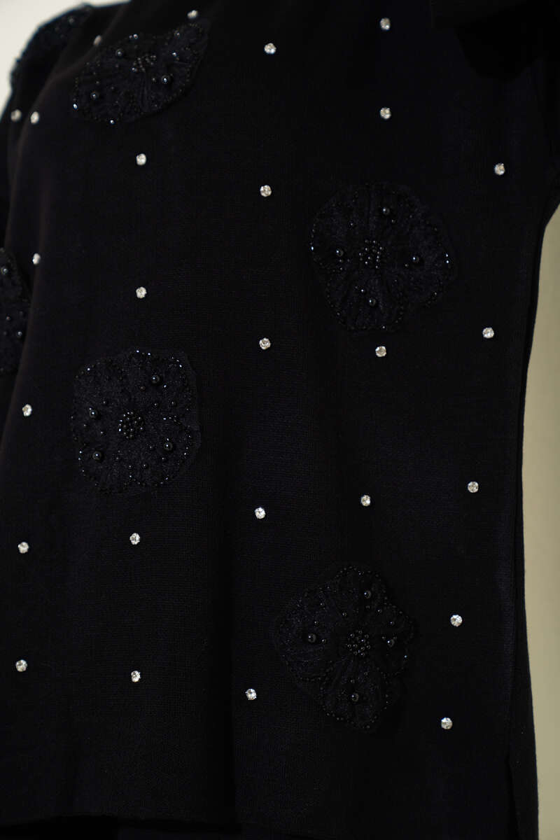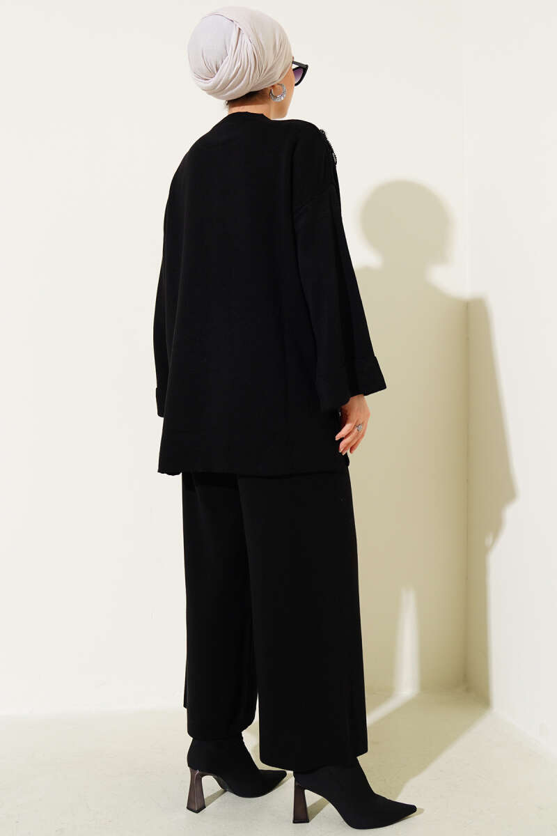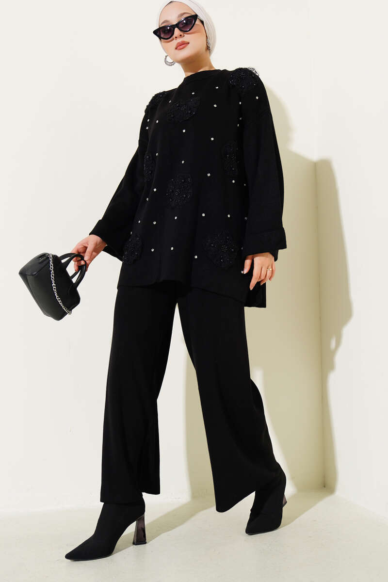 Çiçek Motifli Triko İkili Takım Siyah