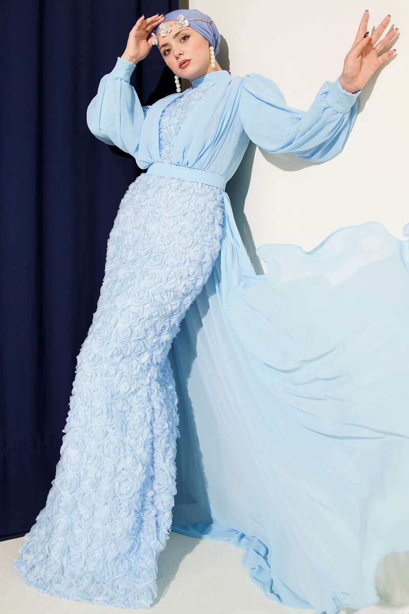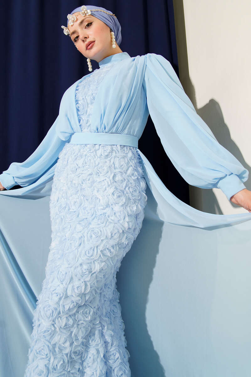 Çiçek Motifli Tül Pelerinli Abiye Elbise Siyah