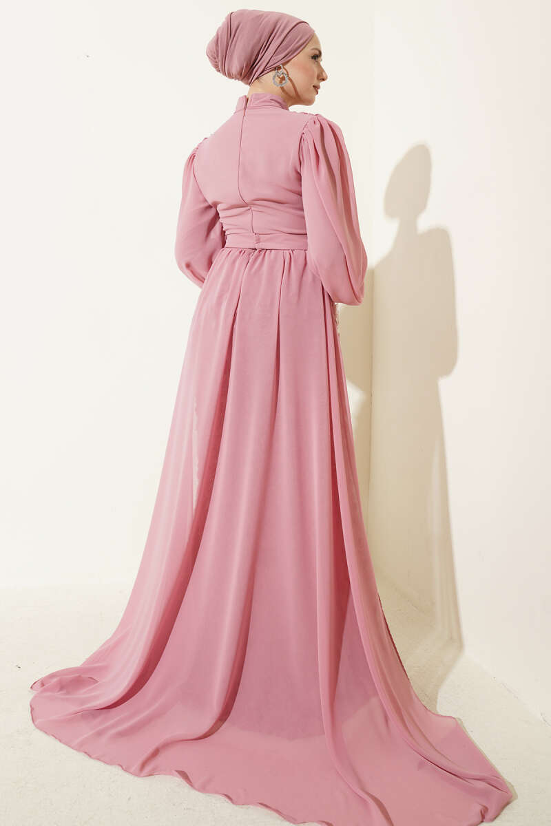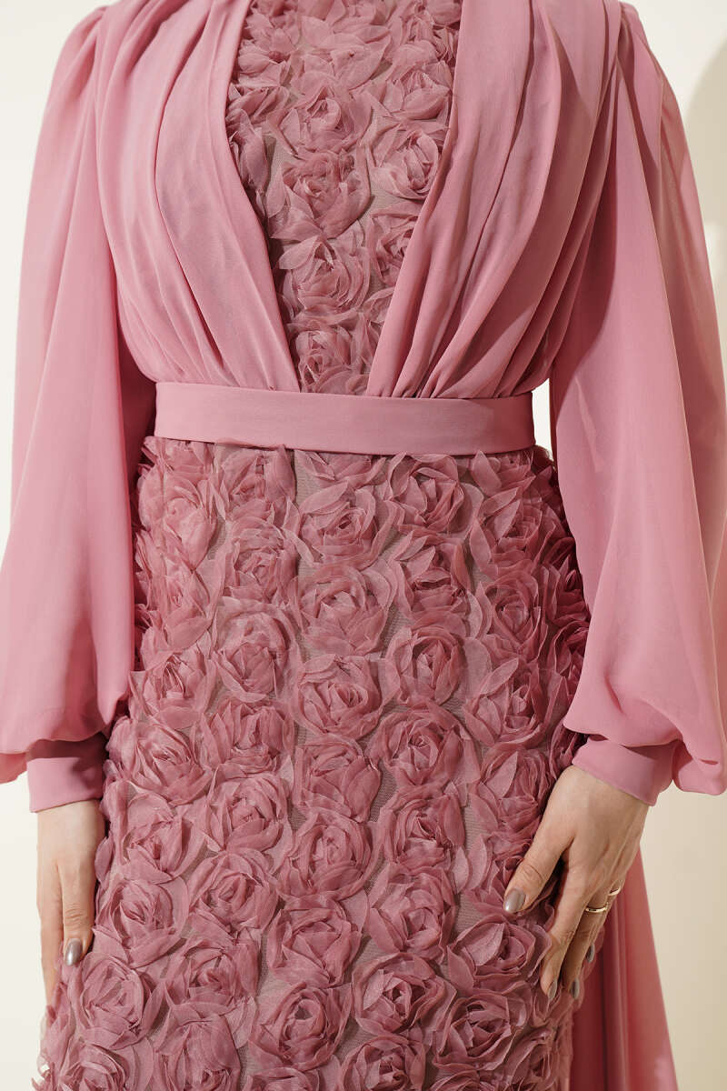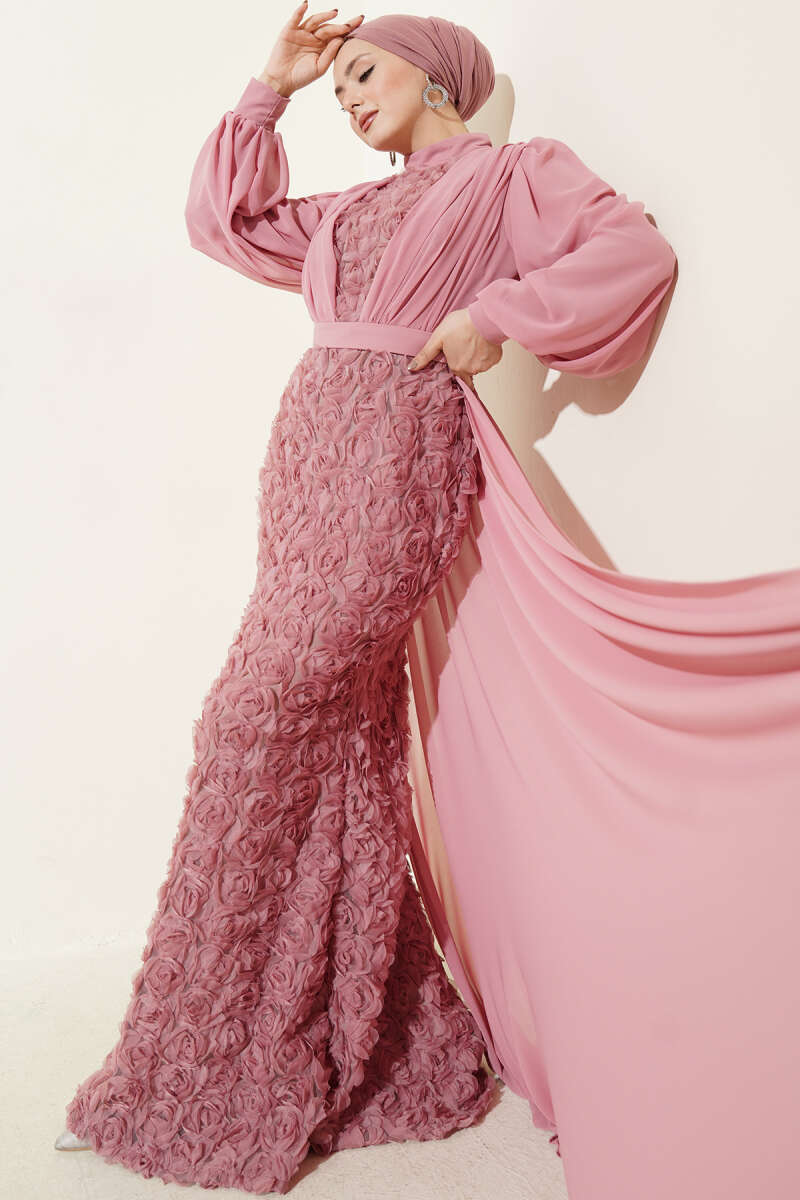 Çiçek Motifli Tül Pelerinli Abiye Elbise Pudra