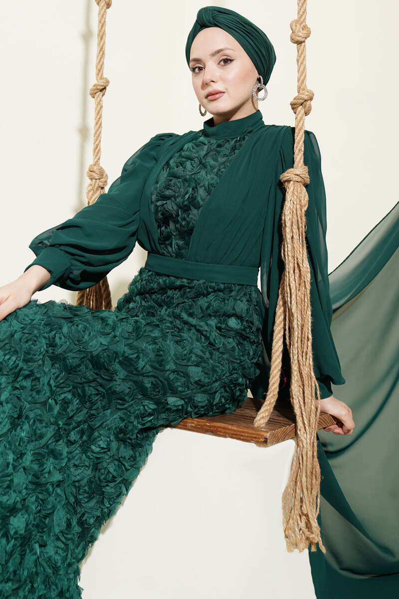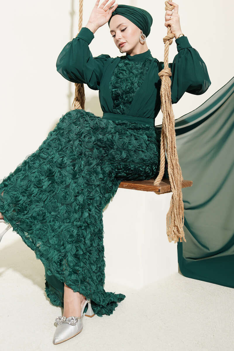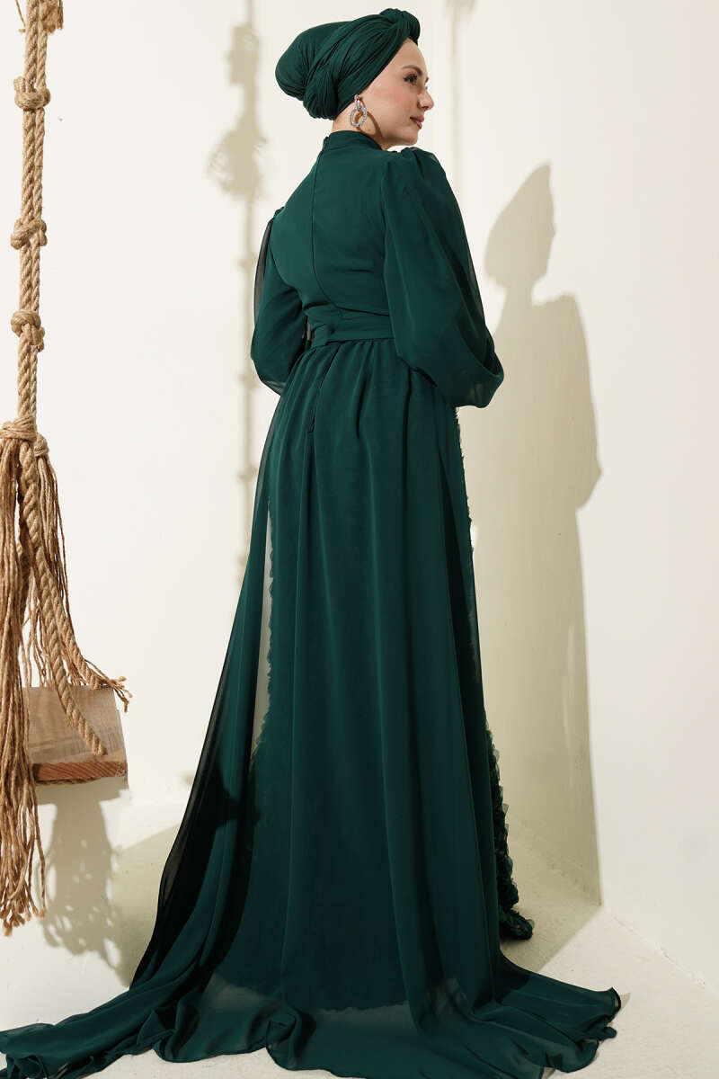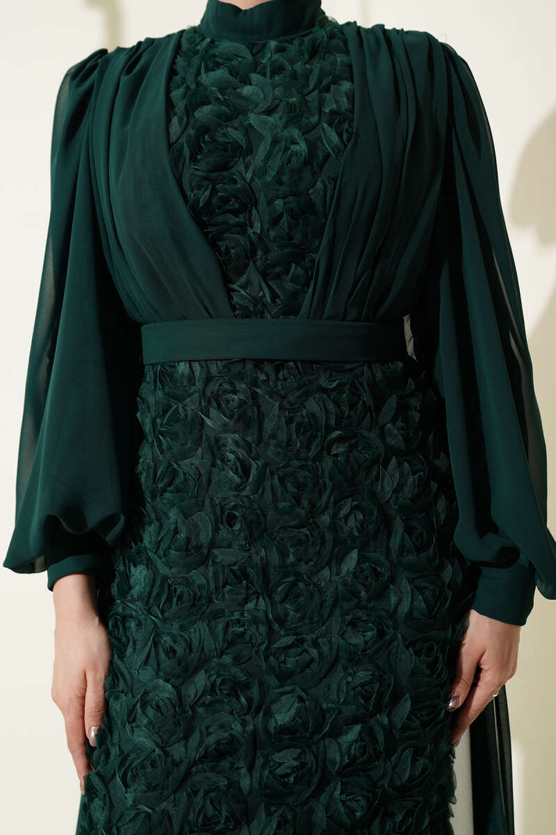 Çiçek Motifli Tül Pelerinli Abiye Elbise Zümrüt