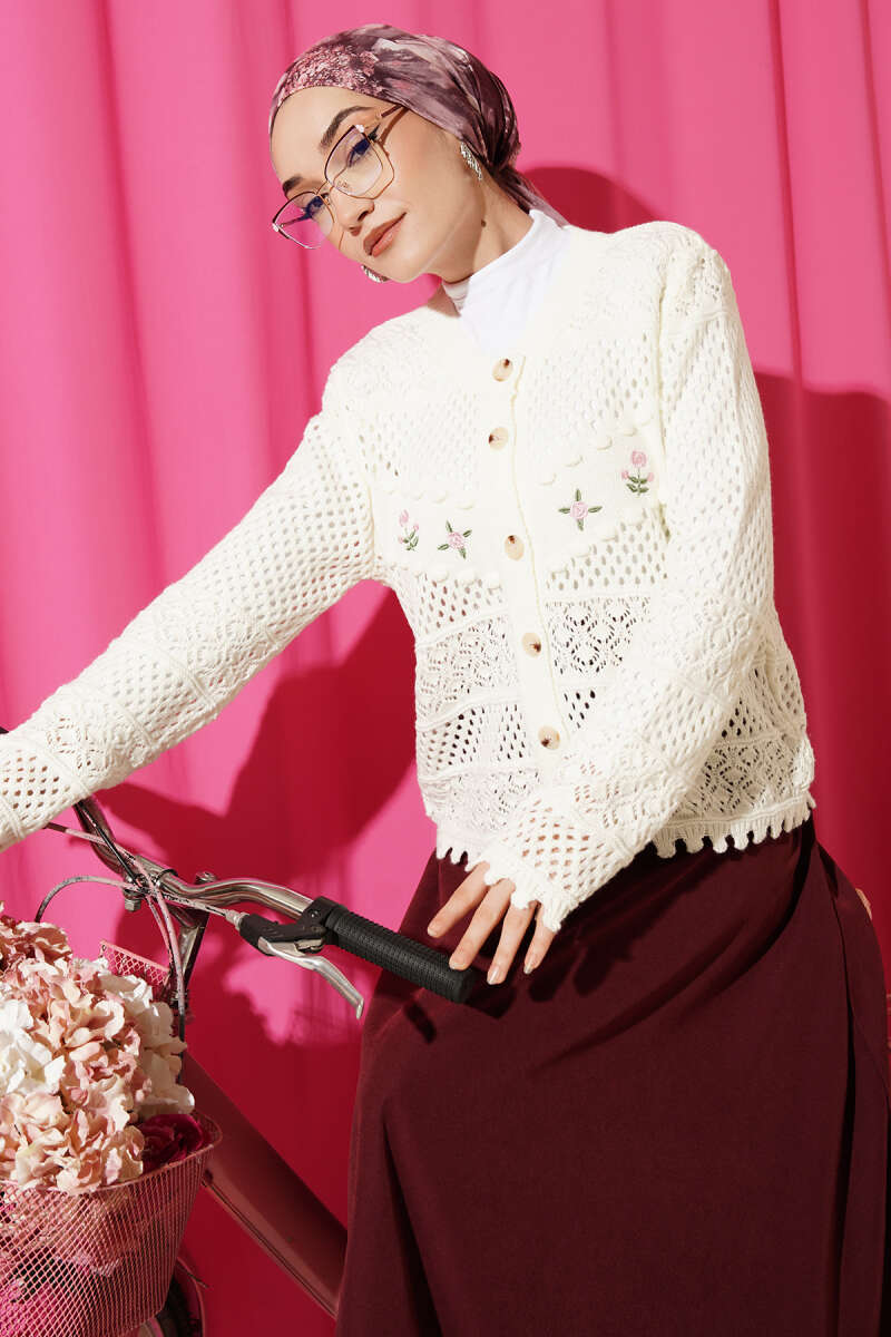 Çiçek Nakış Ajurlu Kısa Triko Hırka Ekru