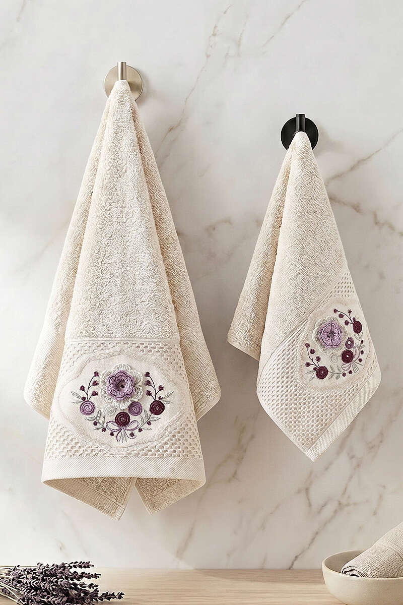 Çiçek Nakış İşlemeli Analı Kızlı Havlu Seti Ekru