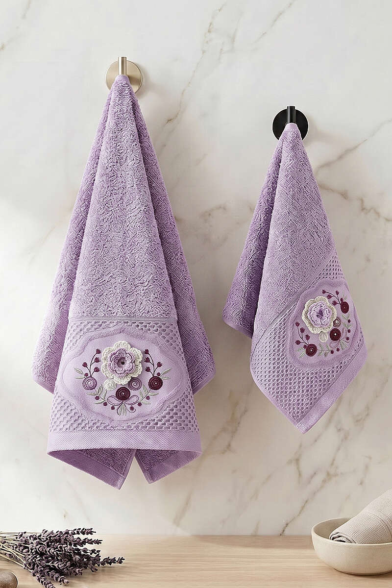 Çiçek Nakış İşlemeli Analı Kızlı Havlu Seti Lila
