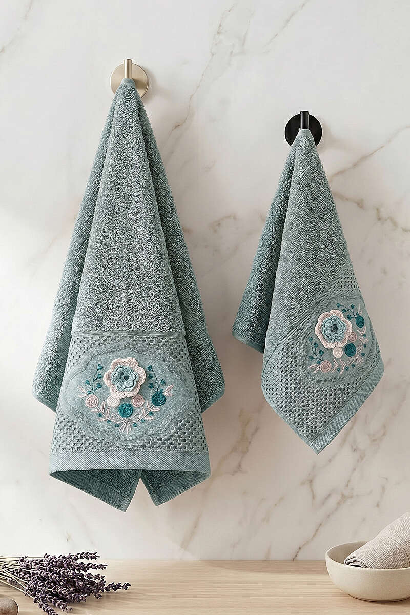 Bu şık ve işlemeli havlu seti, banyonuza hem nostaljik hem de zarif bir hava katacak türden. Üzerindeki nakış ve kabartmalı çiçek detayları, ürünün hassas bir kategoride olduğunu gösteriyor.