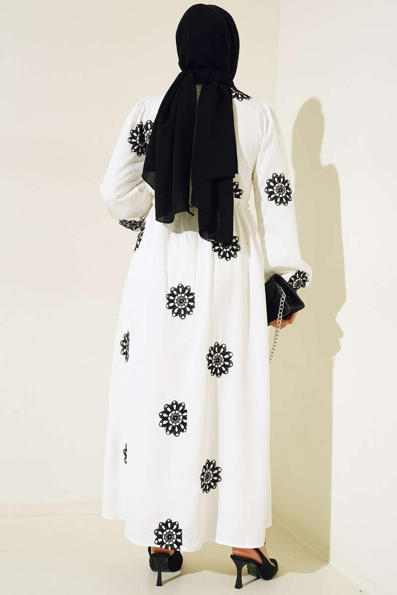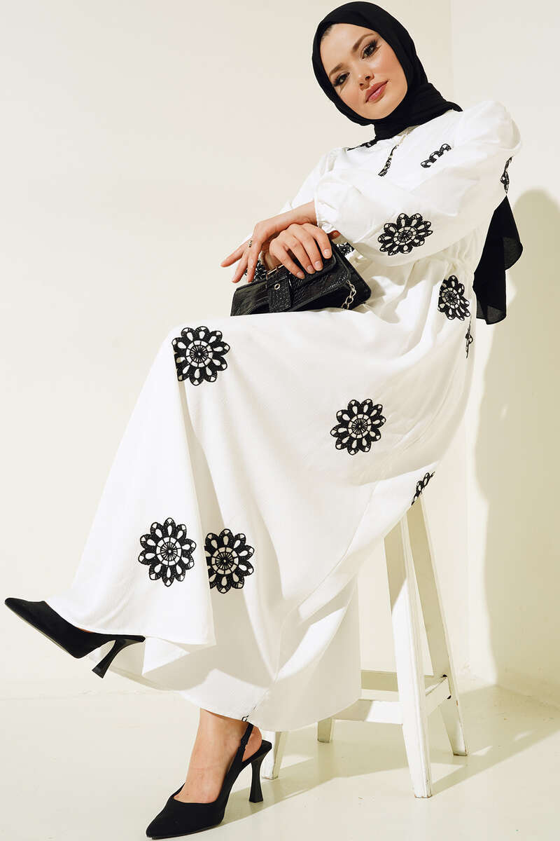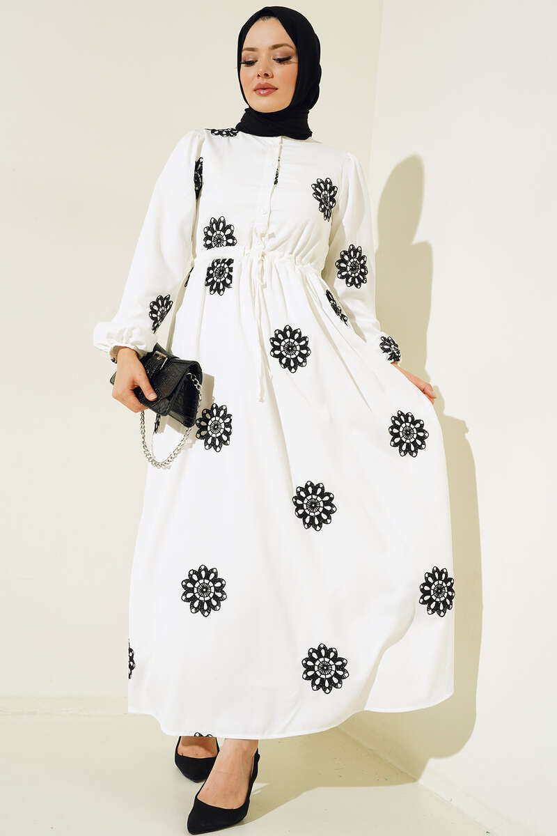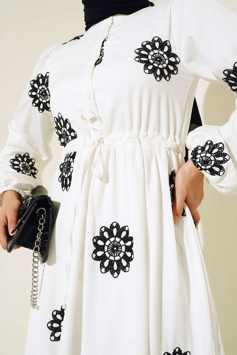 Yeni sezon elbisemiz sade şıklığın imzasını taşımaktadır. Elbisemiz üzerinde bulunan çiçek nakışlarıyla detay kazanmıştır. Beli tünel ip bağlamalı olan elbisemizn bilekleri lastiklidir. Önü yarım pat düğmelidir. Astarlıdır.
