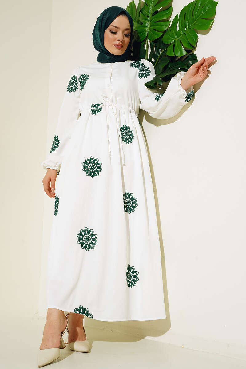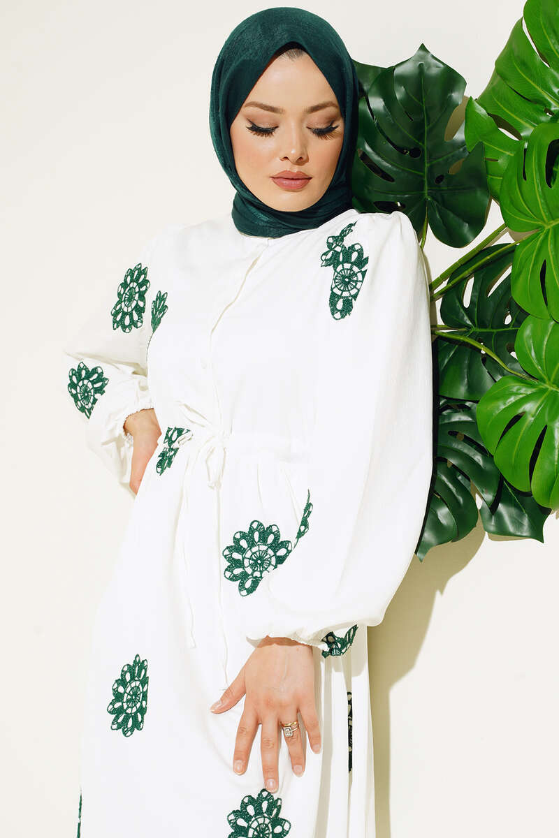 Yeni sezon elbisemiz sade şıklığın imzasını taşımaktadır. Elbisemiz üzerinde bulunan çiçek nakışlarıyla detay kazanmıştır. Beli tünel ip bağlamalı olan elbisemizn bilekleri lastiklidir. Önü yarım pat düğmelidir. Astarlıdır.