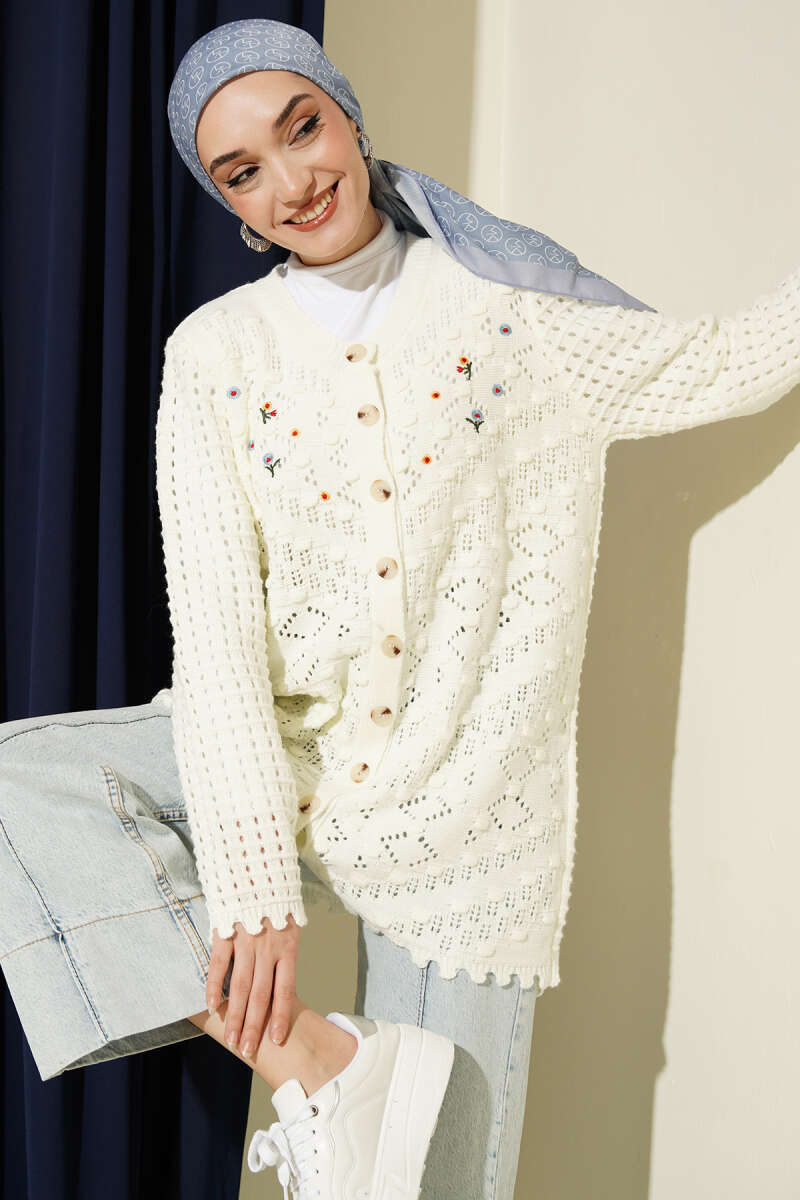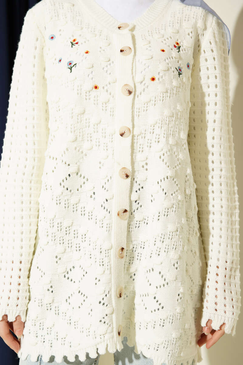 Çiçek Nakışlı Ajurlu Triko Hırka Ekru