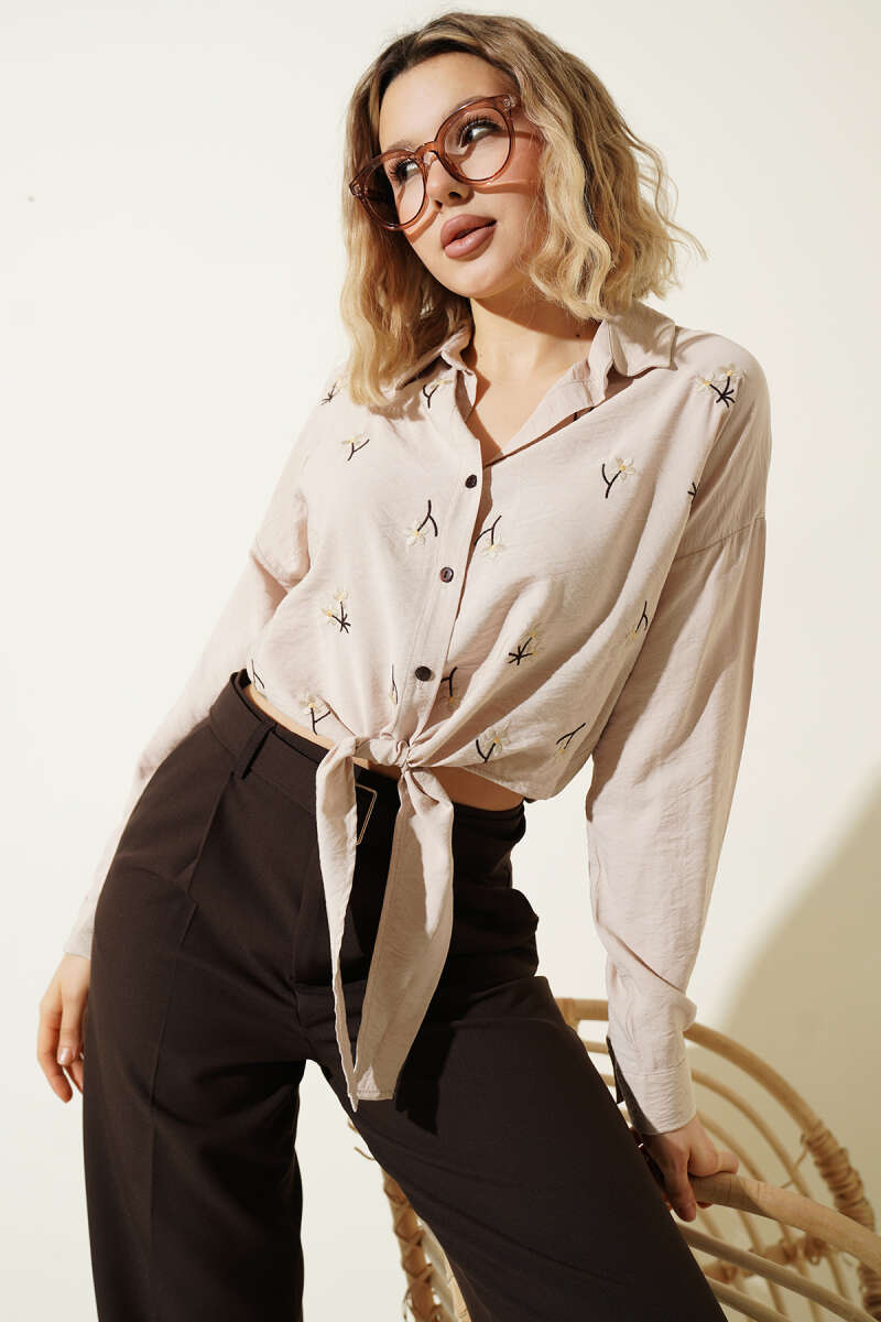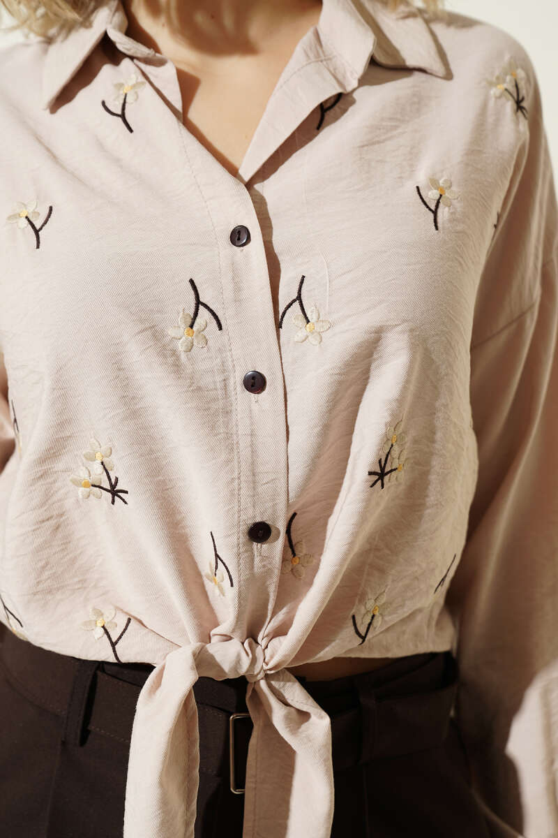 Zarif çiçek nakışlarıyla bahar enerjisini stilinize taşıyan bu gömlek, keten görünümlü doğal dokusuyla hem şık hem de konforlu bir kullanım sunuyor. Klasik gömlek yakası ve kontrast yaratan siyah düğme detayları, tasarıma modern bir karakter kazandırırken belden bağlama özelliği vücut hatlarını zarifçe vurguluyor.