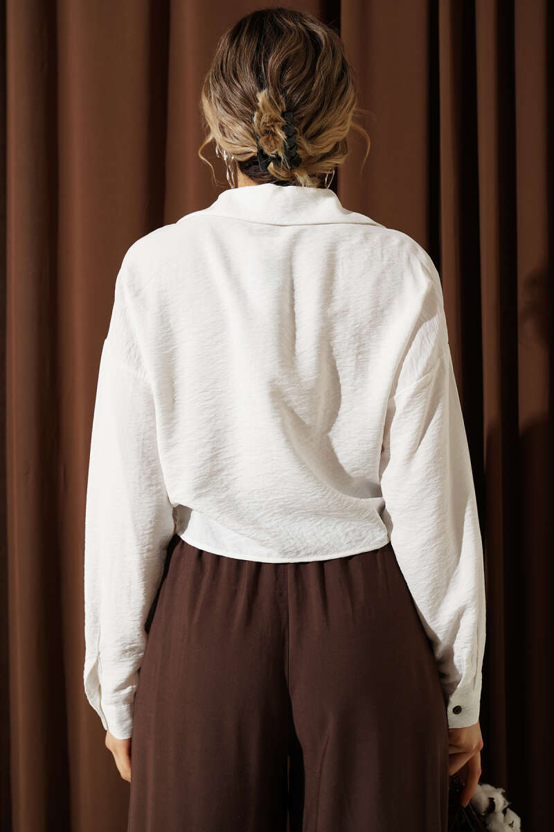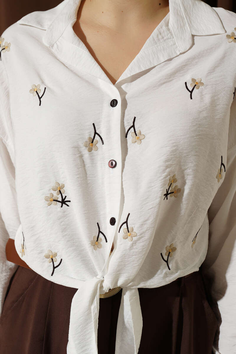 Çiçek Nakışlı Bağlamalı Crop Gömlek Ekru