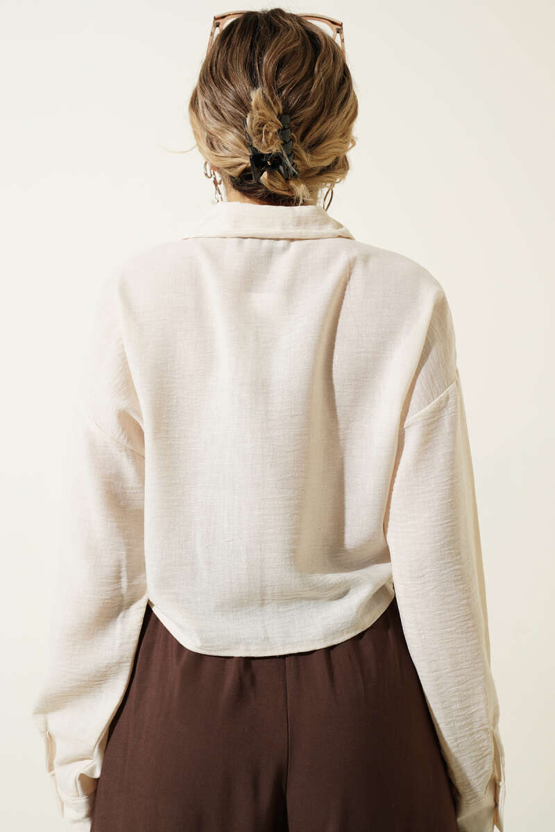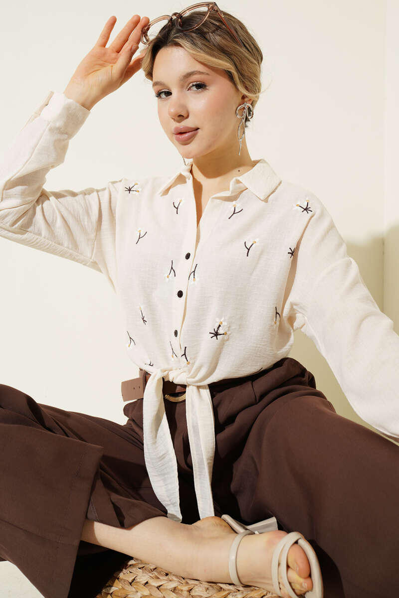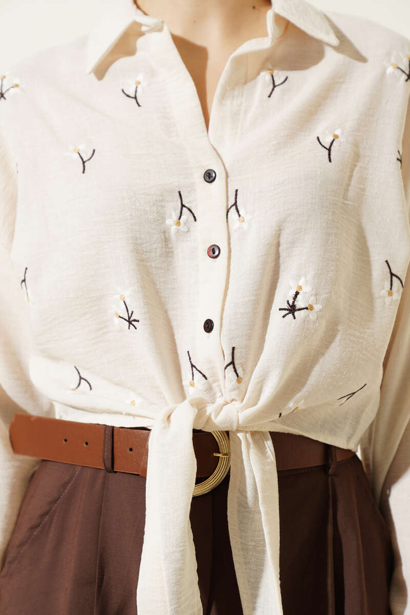 Çiçek Nakışlı Bağlamalı Crop Gömlek Krem