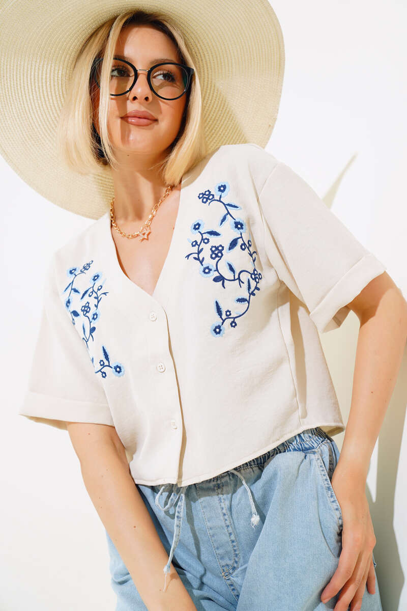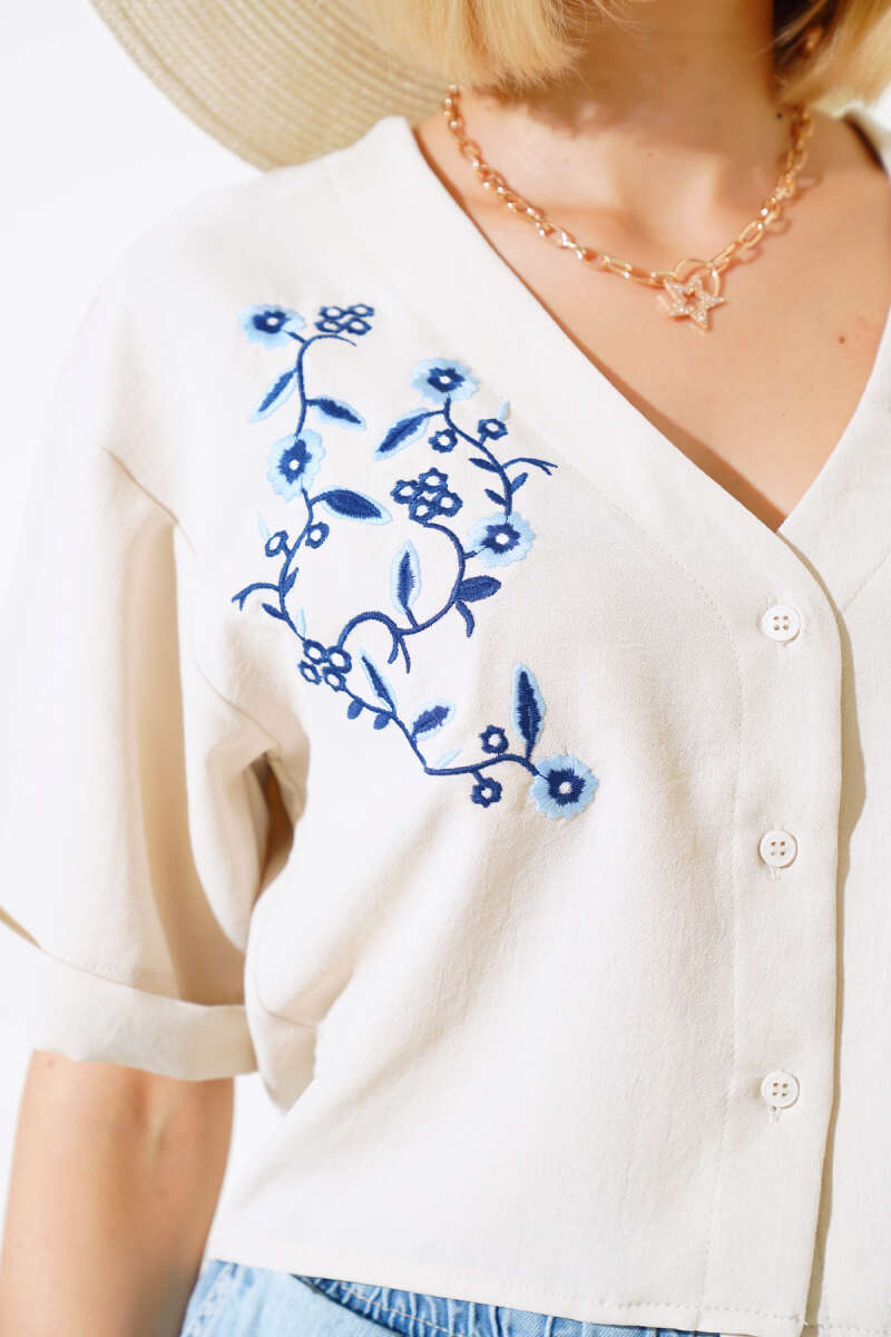 Yan Büzgülü Desenli Tül Bluz Acı Kahve