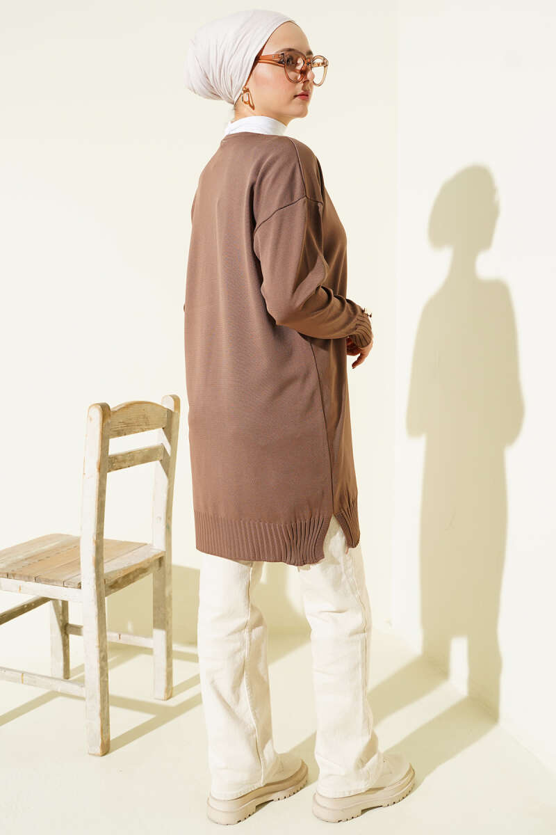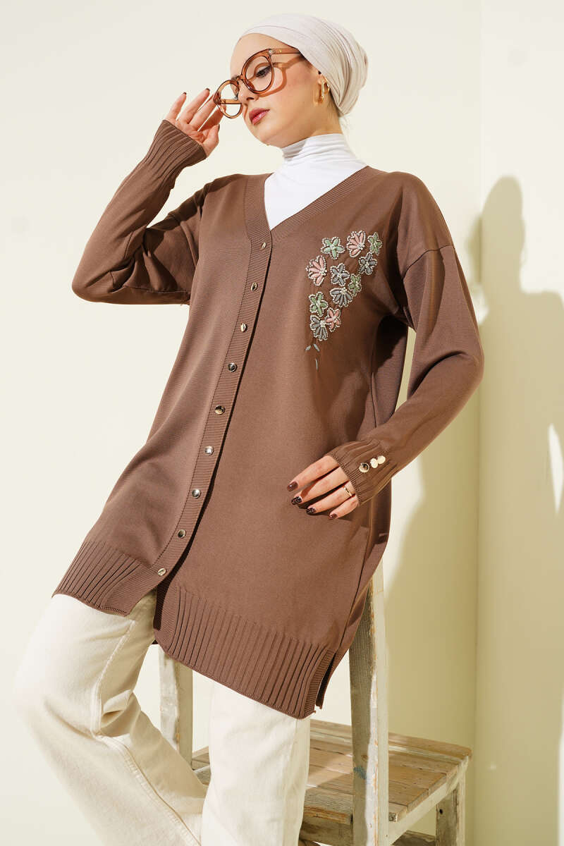 Çiçek Nakışlı Düğmeli Merserize Hırka Kahve