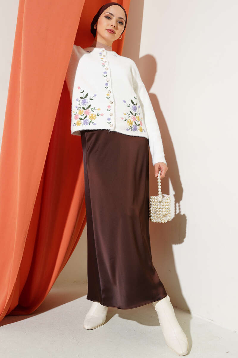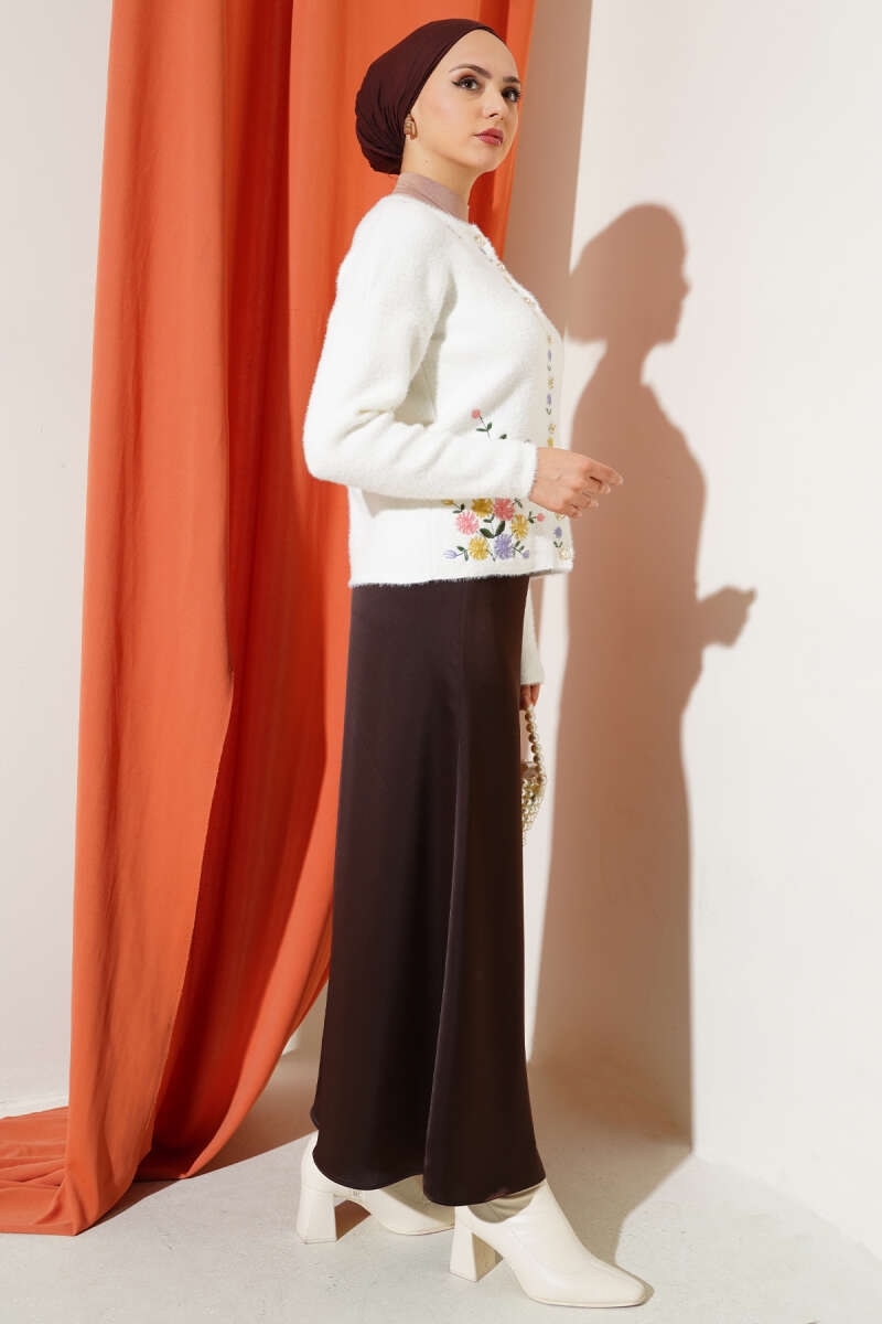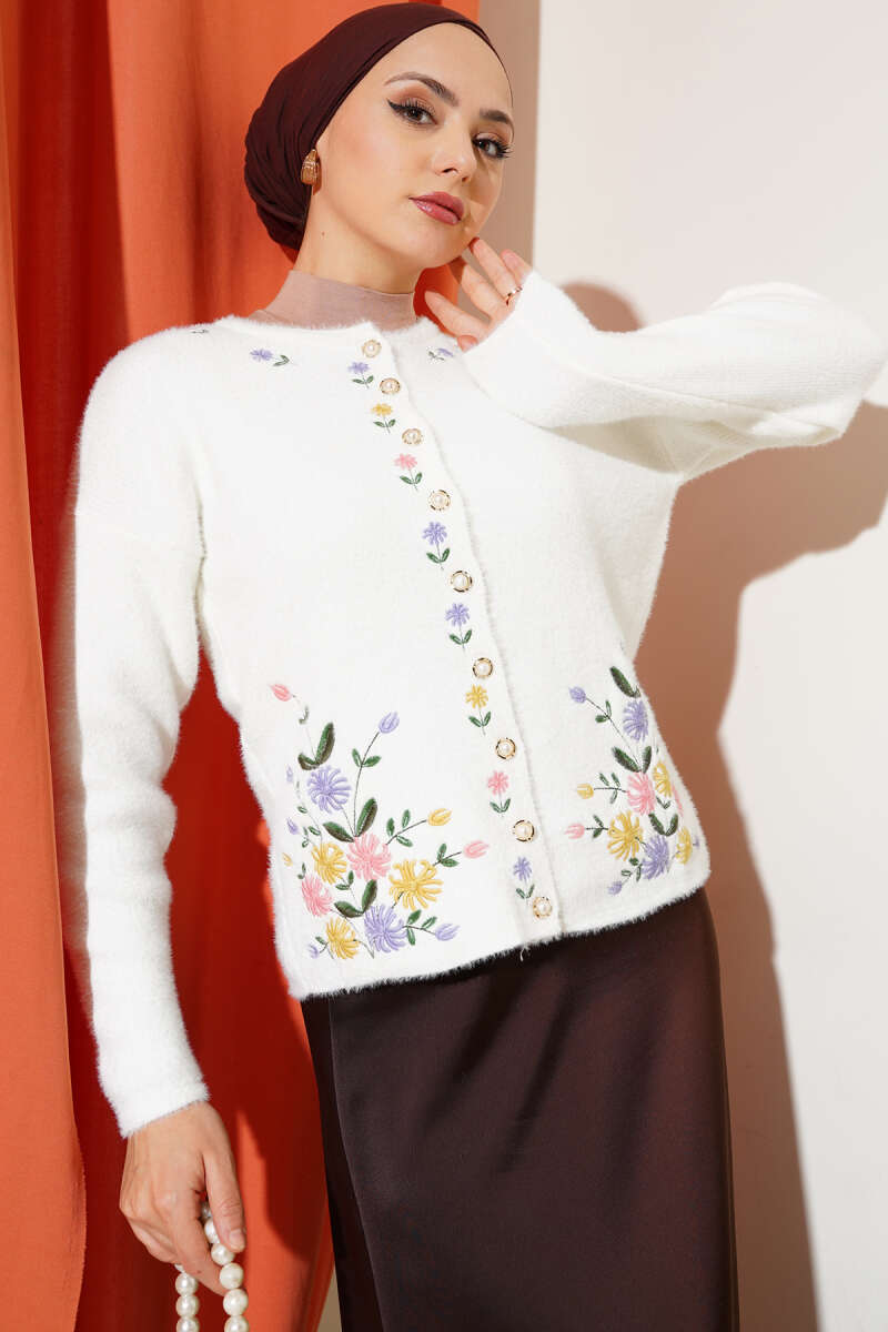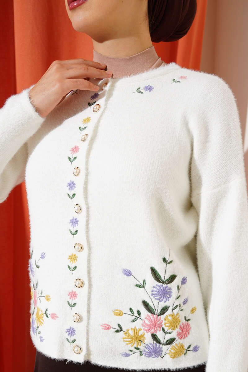 Çiçek Nakışlı Düğmeli Kısa Triko Hırka Beyaz