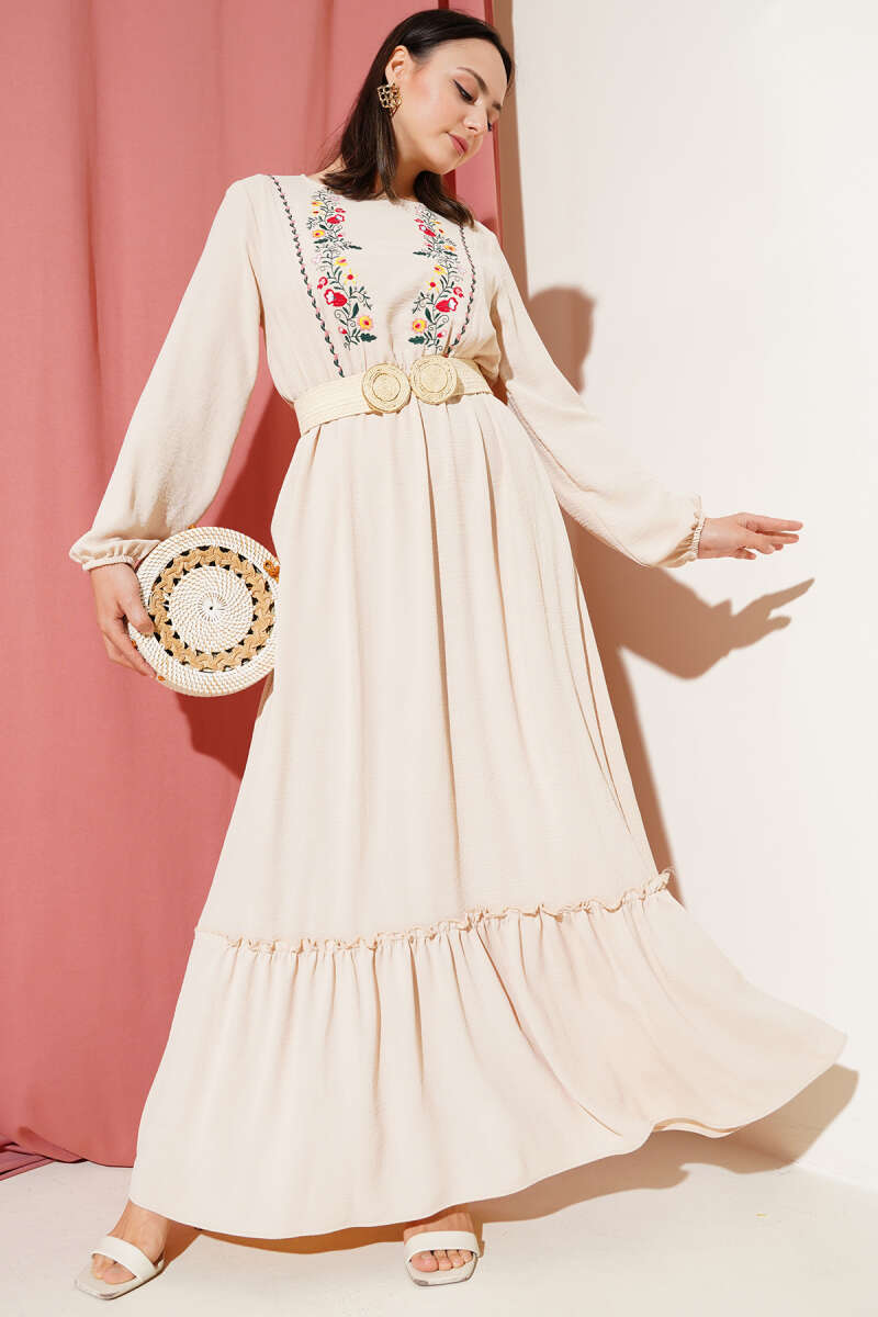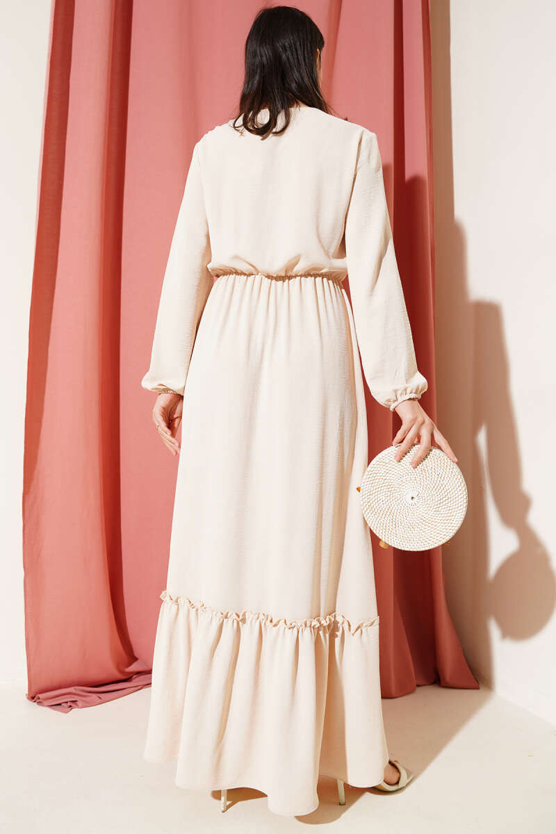 Omuz Pelerin Detaylı Abiye Elbise Bej