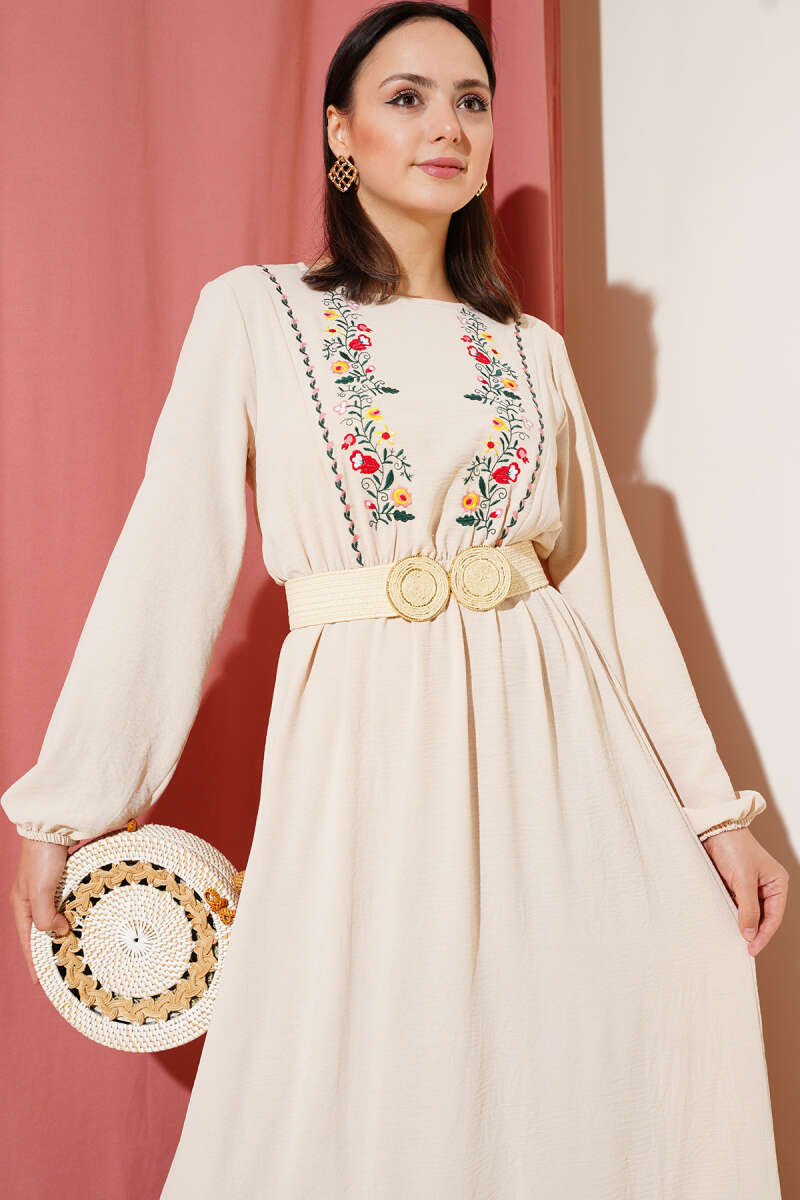 İp Kuşaklı Ajurlu Triko Elbise Ekru