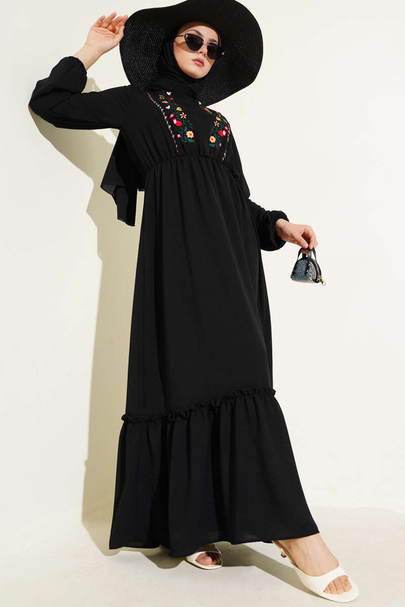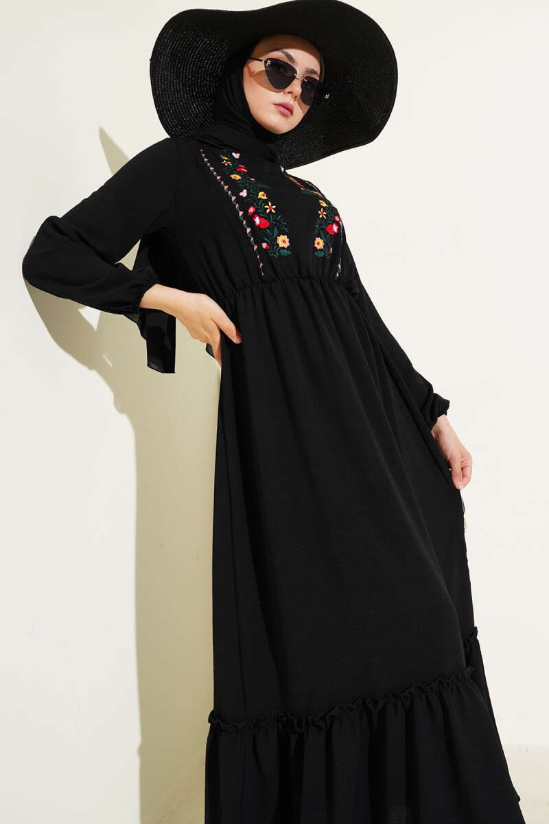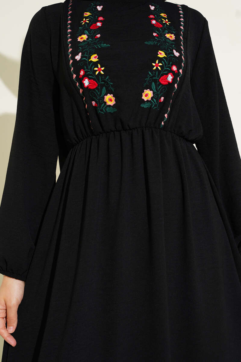 Çiçek Nakışlı Kolu Lastikli Elbise Gül Kurusu