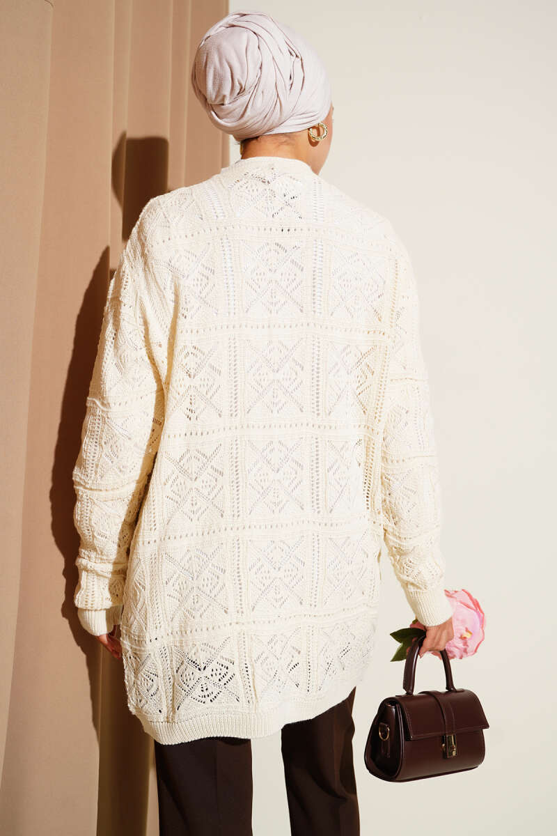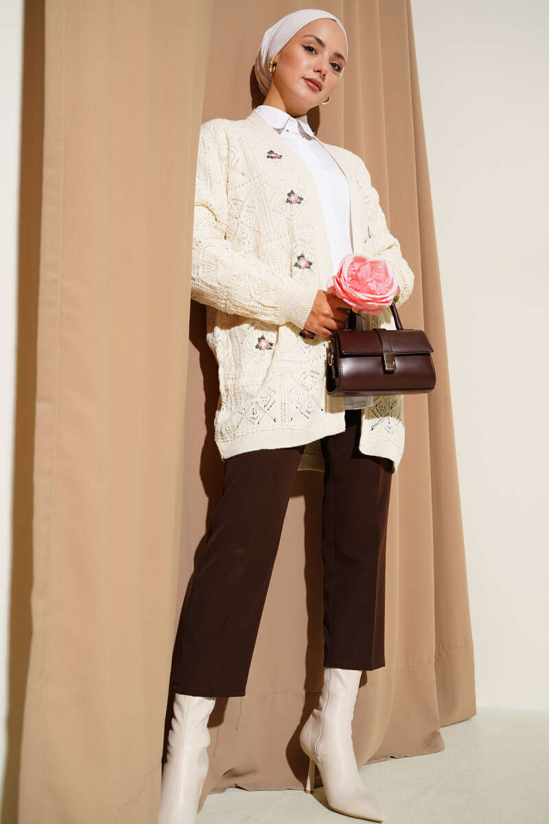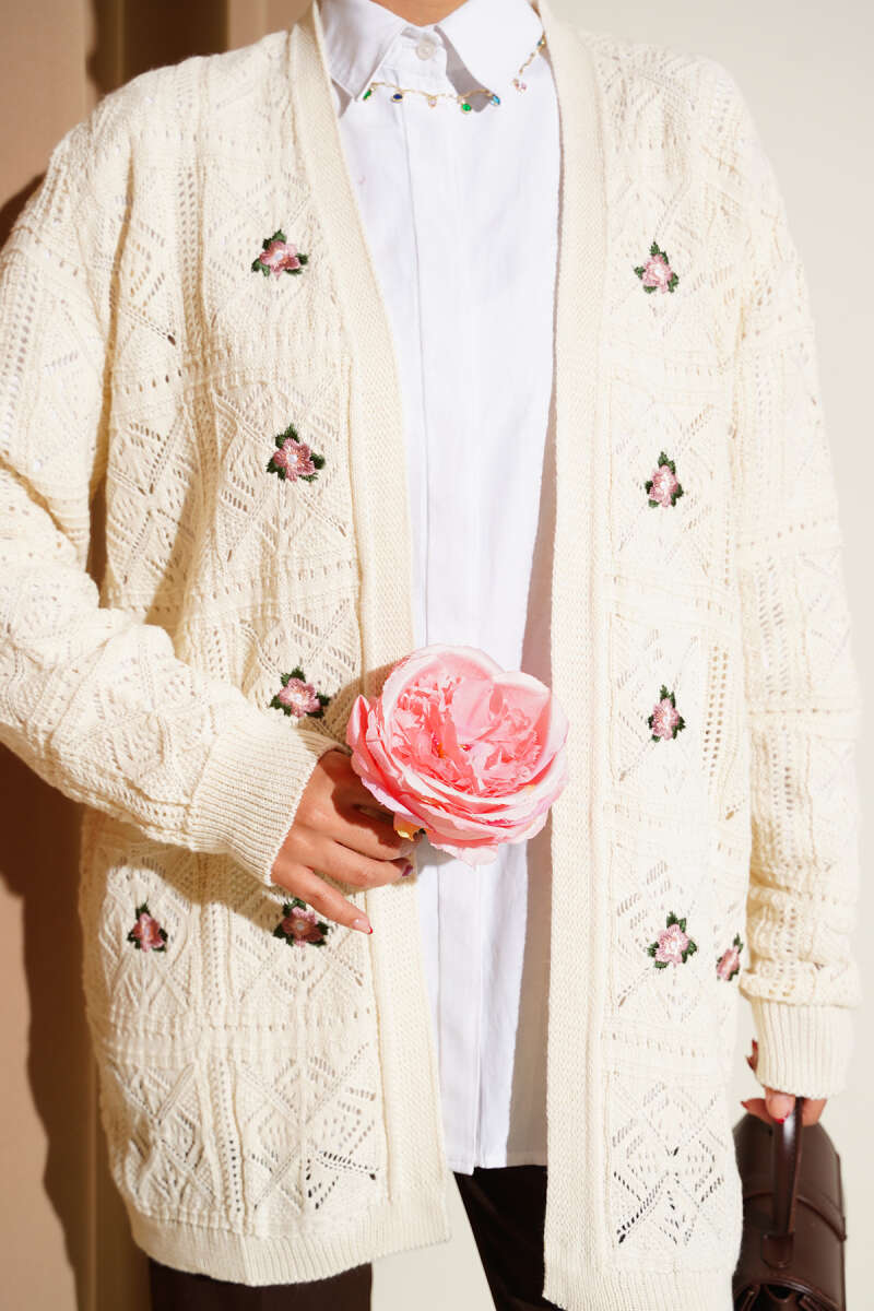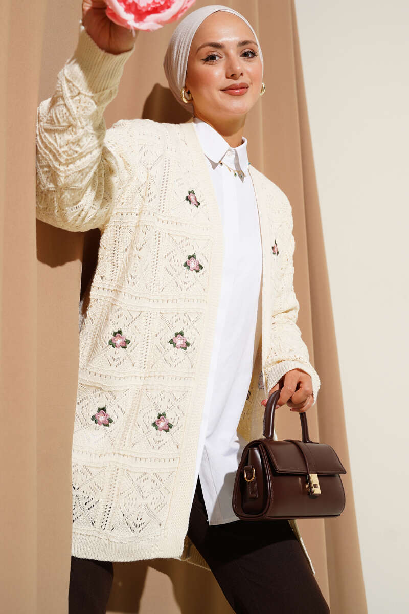 Çiçek Nakışlı Ajurlu Triko Hırka Bej