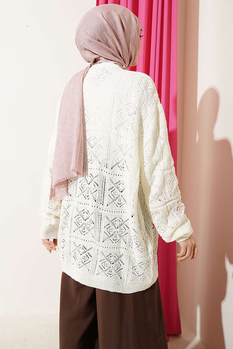 Düğmeli Desenli Triko Kısa Ajur Hırka Ekru