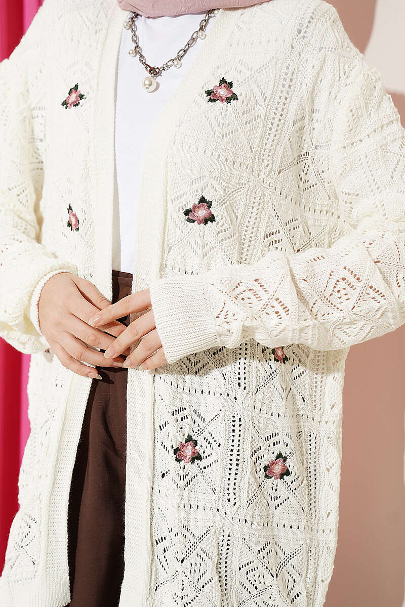 Çiçek Nakışlı Örgü Triko Hırka Ekru