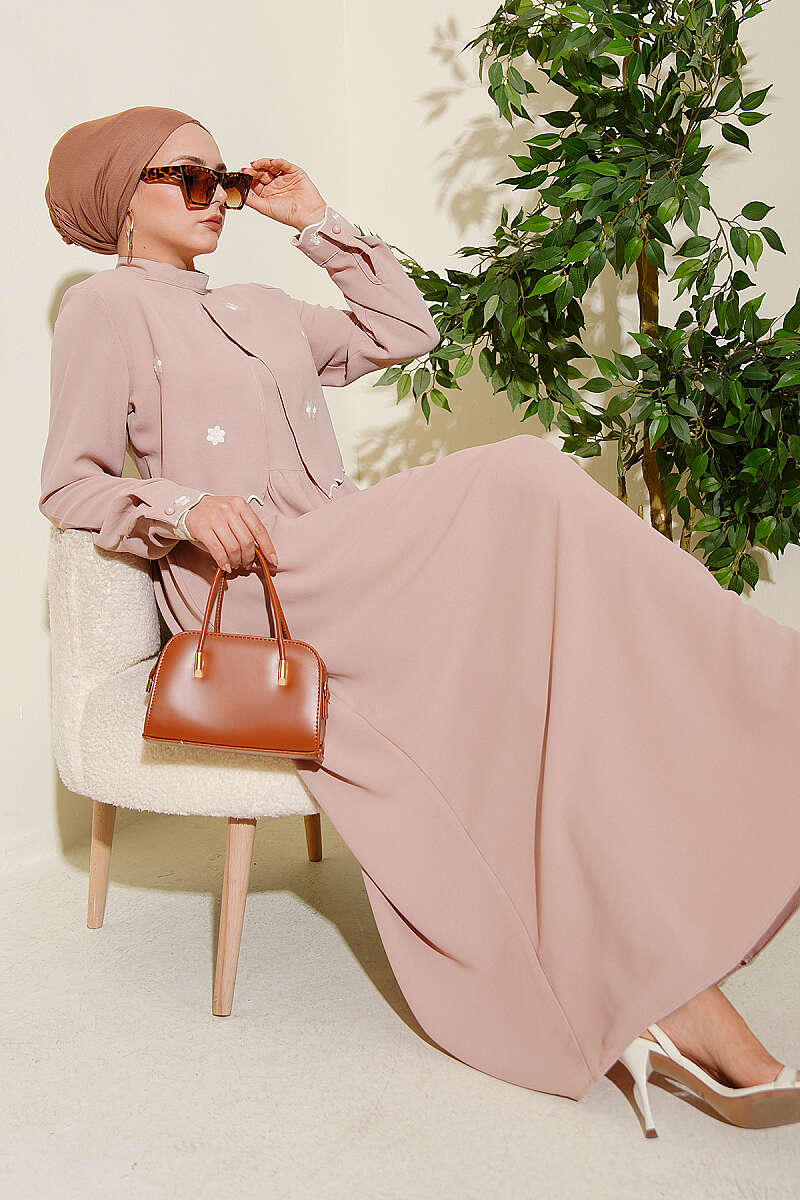 Çiçek Nakışlı Pelerinli Elbise Kahve