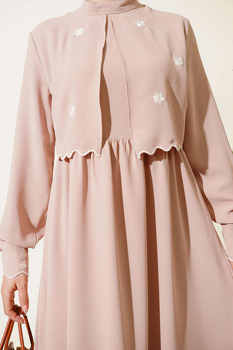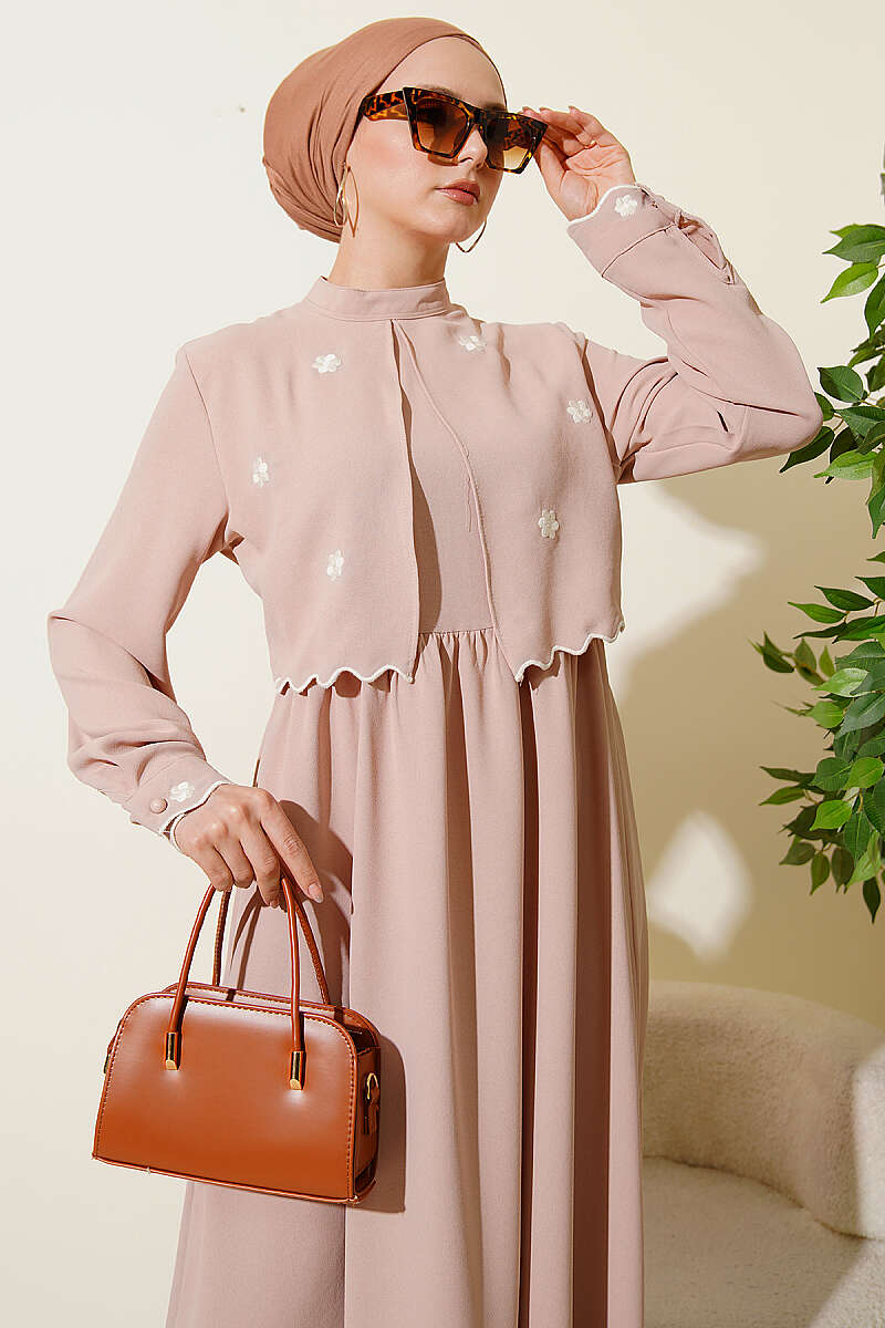 Çiçek Nakışlı Pelerinli Elbise Bej