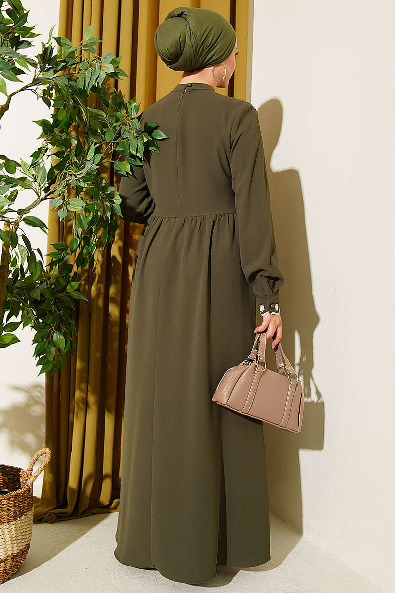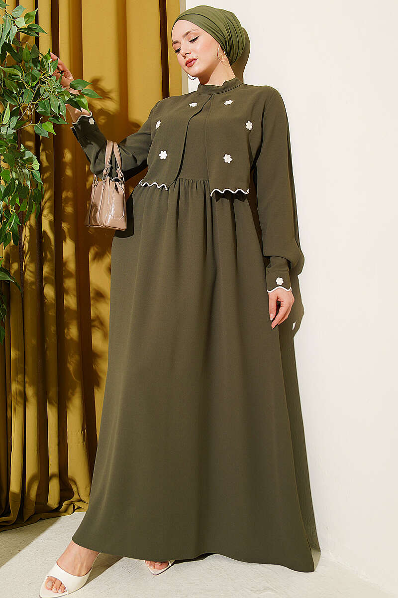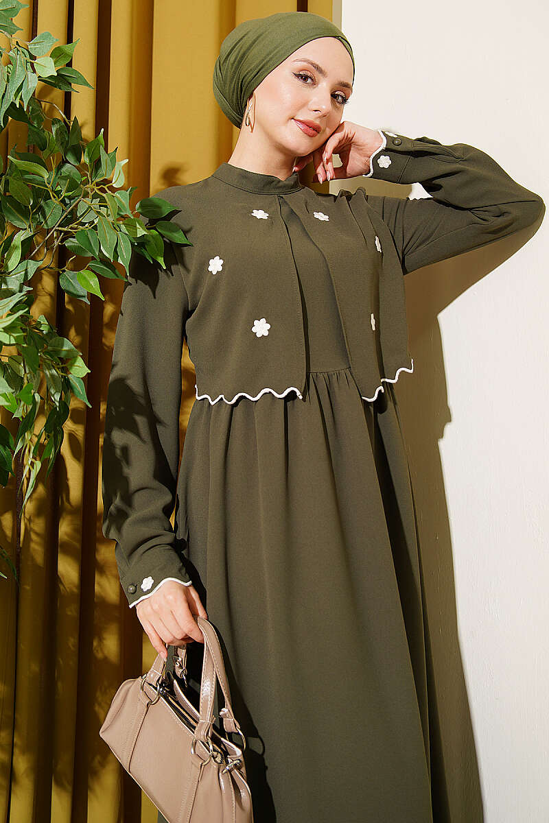 Çiçek Nakışlı Pelerinli Elbise Haki