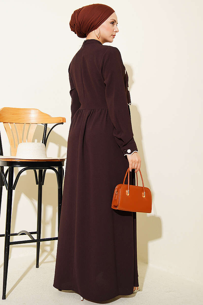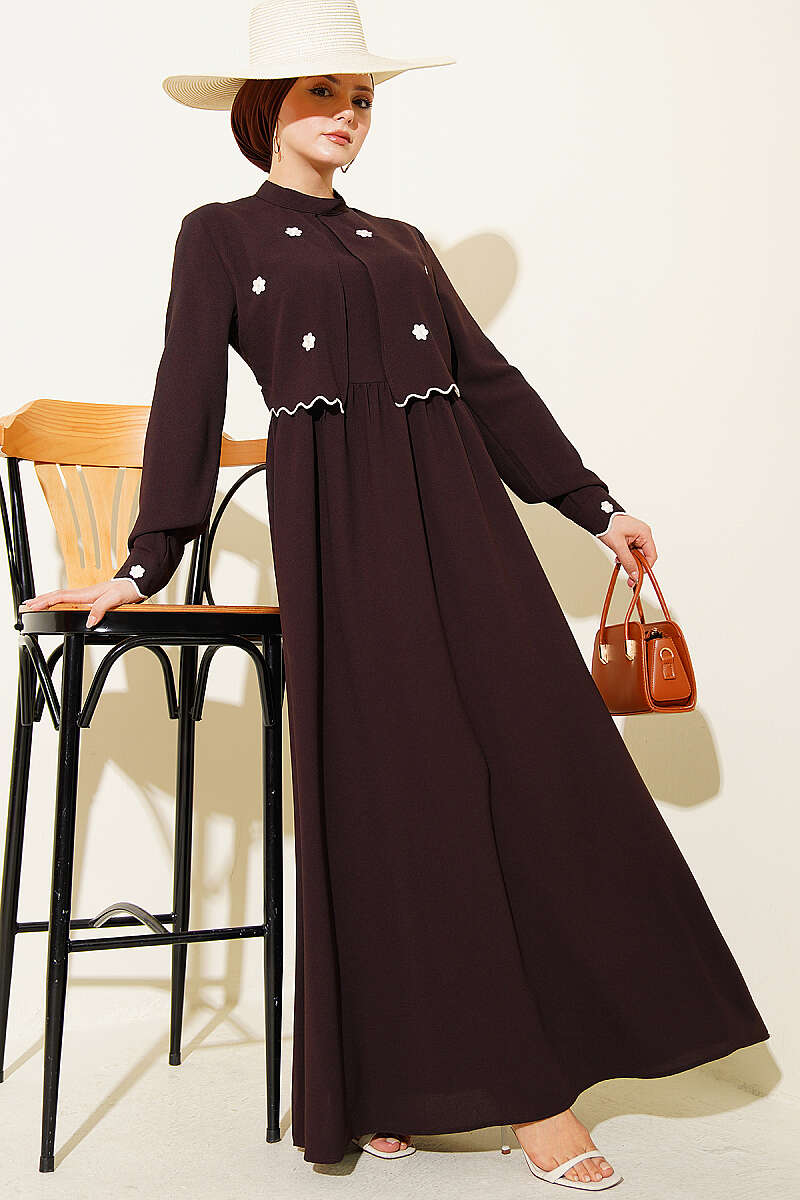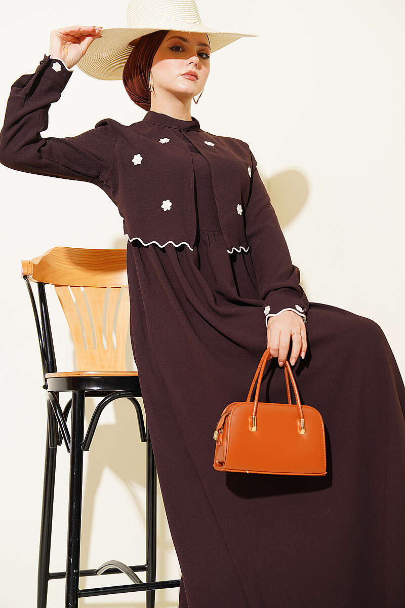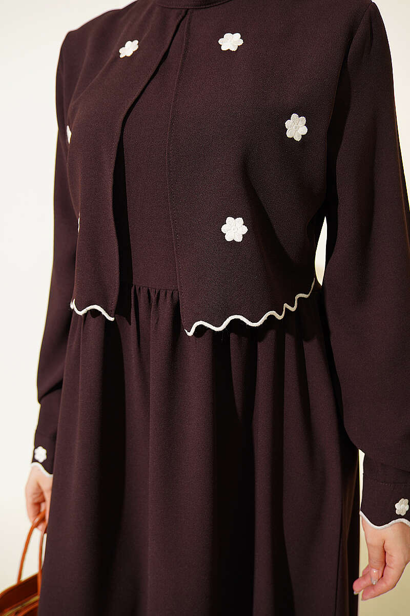 Çiçek Nakışlı Pelerinli Elbise Kahve