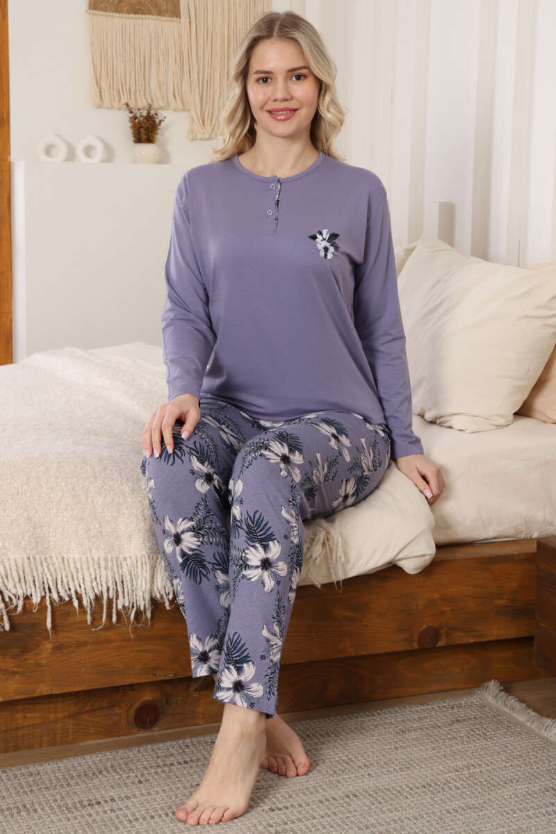 Çiçek Nakışlı Uzun Kol Pijama Takımı Lila
