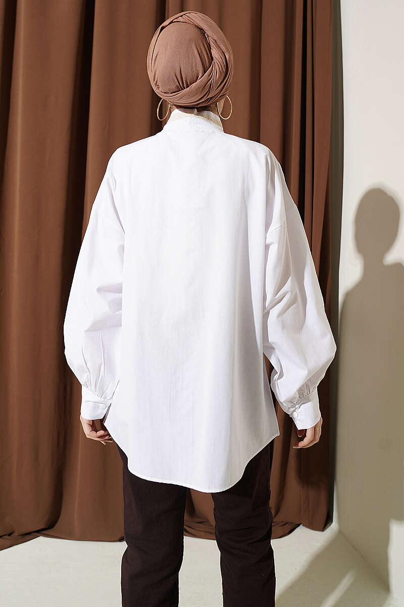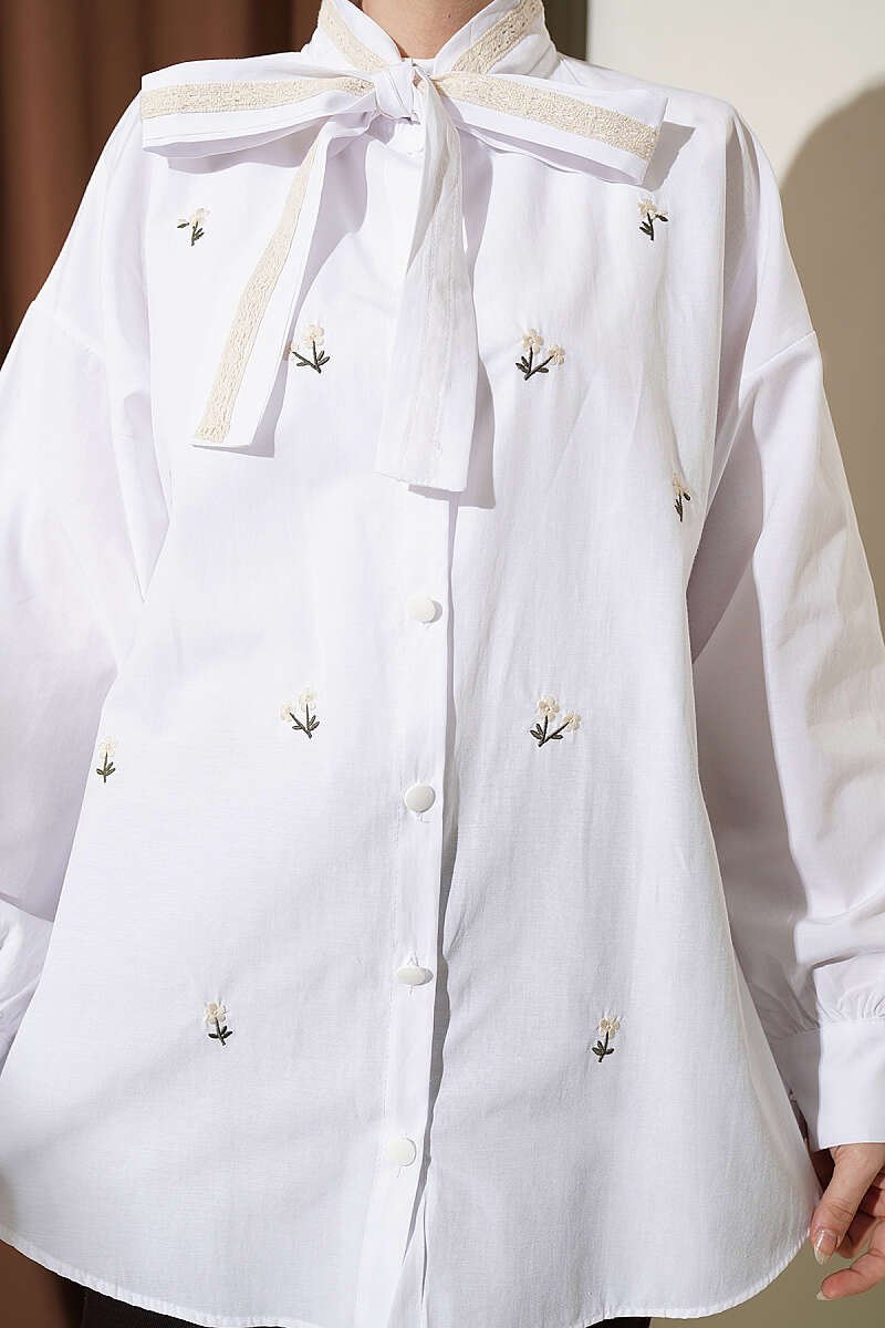 Çiçek Nakışlı Yakası Bağlamalı Gömlek Beyaz
